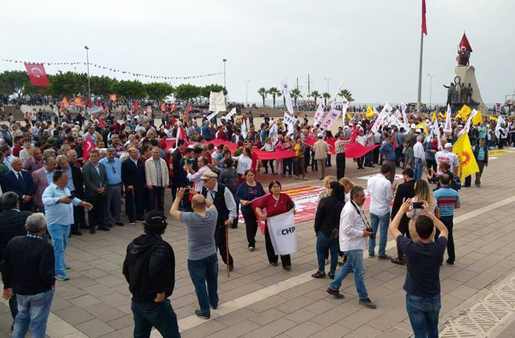 Toplanan vatandaşlar davul zurna eşliğinde halaylar çekerek 1 Mayıs’ı coşkuyla kutladı. Burada bir basın açıklaması yapan Tertip Komitesi Üyesi Ali Karadaş: “Ülkemiz ve bölgemiz tarihsel olarak kritik gelişmelerin yaşandığı bir süreçten geçmekte; iktidarın darbecilerle mücadele adına ilan ettiği OHAL ve KHK’lar halkı ve emekçileri mağdur etmeye devam ediyor. Mağdur edilen yüz binlerce emekçinin mağduriyetlerini giderecek bir muhatabı bile yok. Biz 16 Nisan’da tek adam rejiminin kurulmaması için ‘Hayır’ dedik.