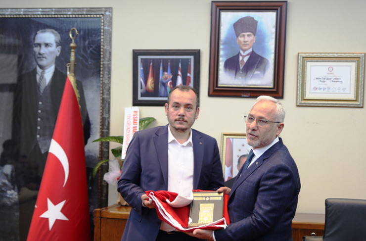 Yapılan konuşmaların ardından İlçe Başkanı Güven, Başkan Tosyalı’ya Türk Bayrağı ve Kuranı Kerim hediye etti.