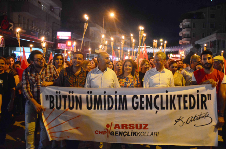Cumhuriyet Halk Partisi (CHP) Arsuz İlçe Örgütü tarafından 19 Mayıs Atatürk’ü Anma, Gençlik ve Spor Bayramı dolayısıyla “Fener Alayı” yürüyüşü düzenlendi.