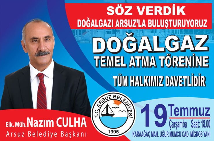 Göreve başladıkları günden itibaren her alanda Arsuz’u geliştirmek ve daha ileriye taşımak için mücadele ettiklerini dile getiren Başkan Nazım Culha, hızla gelişen ve büyüyen Arsuz’u temiz ve ucuz enerjiyle kavuşturacak olan doğalgaz atma törenine herkesi davet etti.