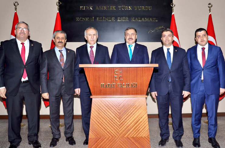 Bakan Eroğlu’na Valilik ziyaretinde Ak Parti Hatay Milletvekilleri Orhan Karasayar, Adem Yeşildal ve Ak Parti Hatay İl Başkanı Ahmet Atıç da eşlik etti. (Haber: Helga TERBİYELİ)