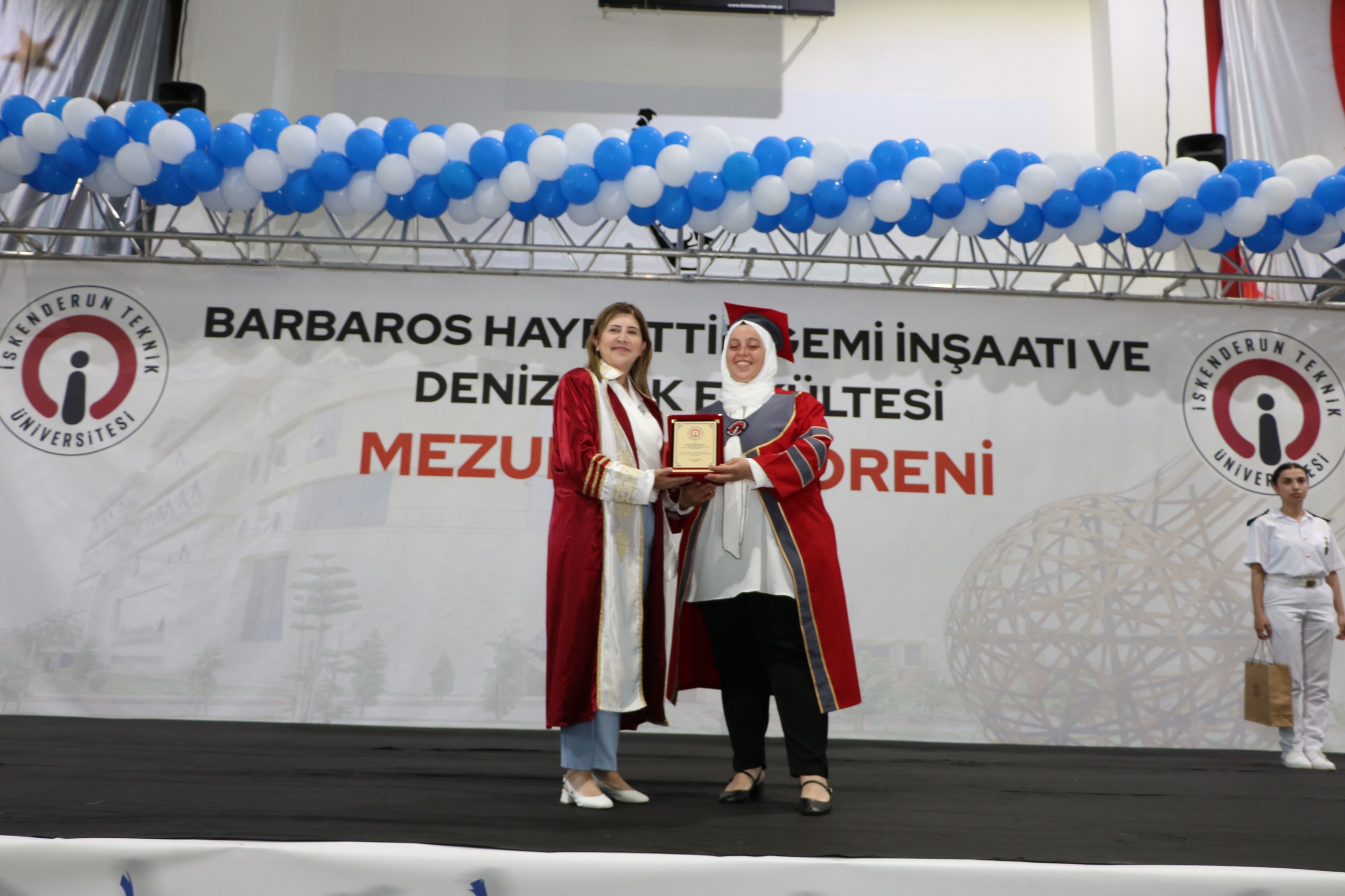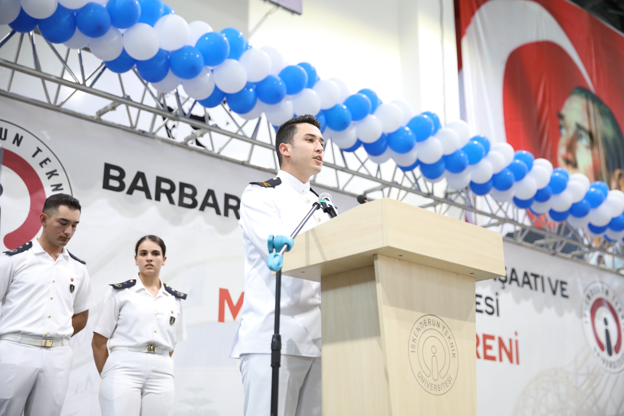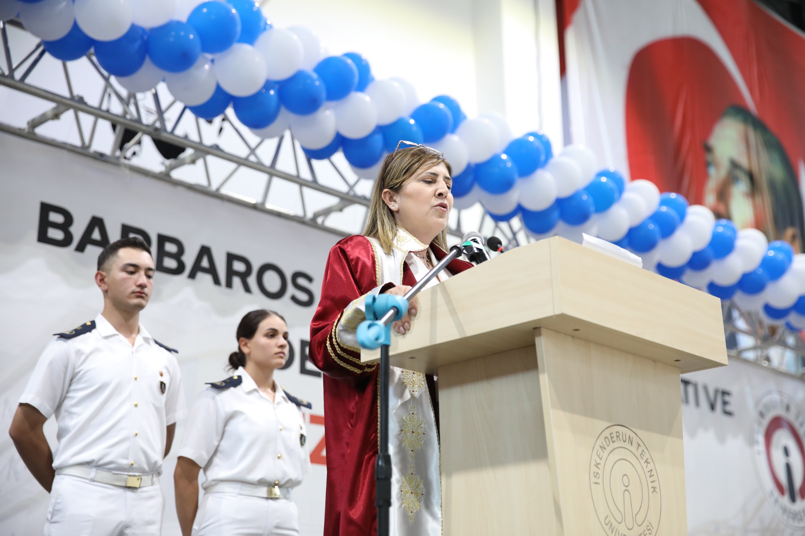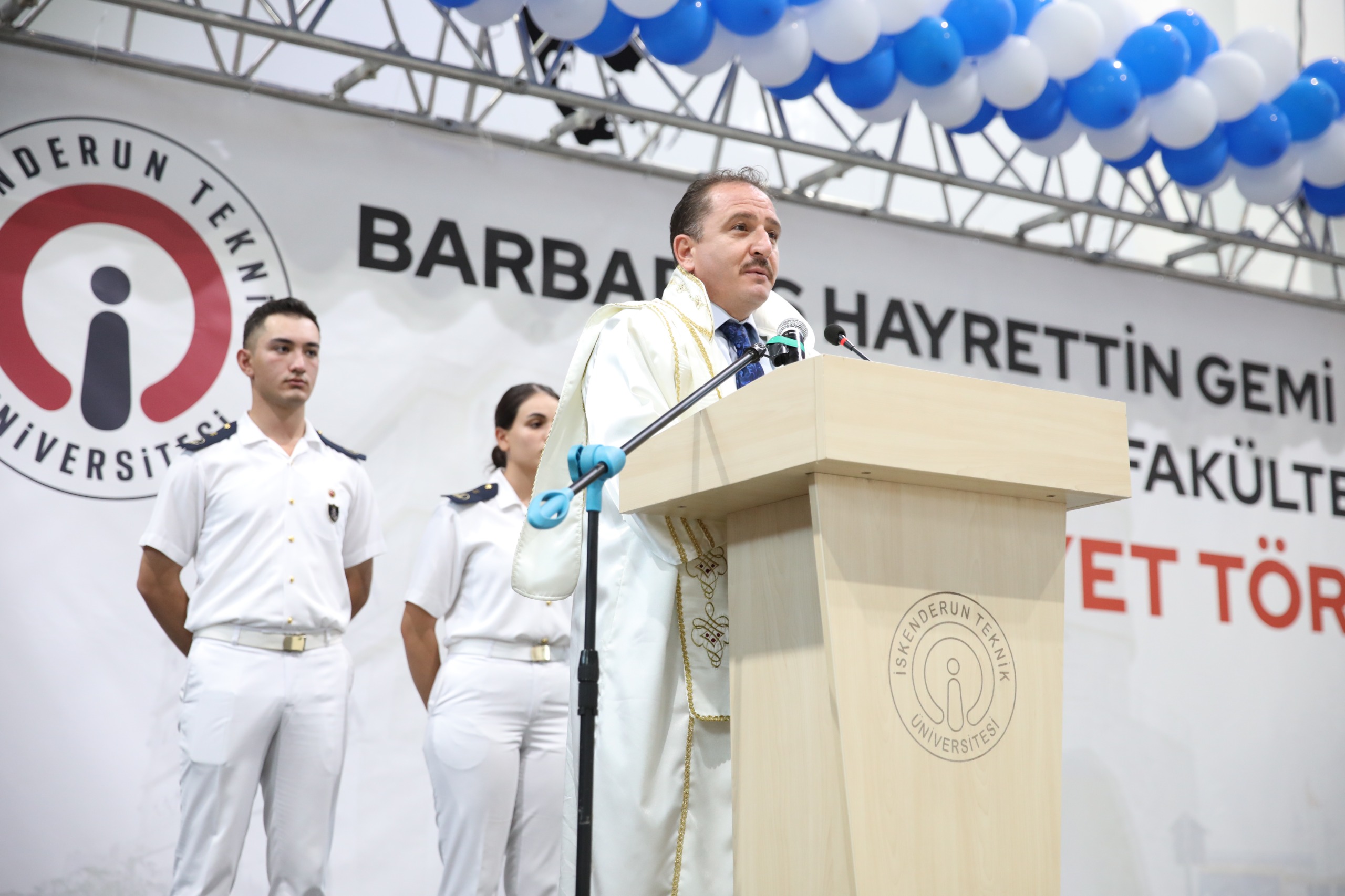 2023-2024 Barbaros Hayrettin Gemi İnşaatı ve Denizcilik Fakültesi mezuniyet töreni 16 Mayıs Perşembe günü İSTE Merkez Yerleşkesi Kapalı Spor Salonunda gerçekleştirildi. Yoğun ilginin olduğu törene İSTE Rektörü Prof. Dr. Tolga Depci ve Eşi Doç. Dr. Aytemis Depci ev sahipliği yaparken, İskenderun Kaymakamı Murat Sefa Demiryürek, Belen Belediye Başkan Vekili İsmail Kahraman, İskenderun İlçe Emniyet Müdürü Nevzat Güneş, İskenderun Deniz Ticaret Odası Başkanı Kemal Kutlu, denizcilik sektörünün önde gelen isimleri, İSTE akademik ve idari personeli, mezun öğrencilerin aileleri ve öğrenciler katıldı.