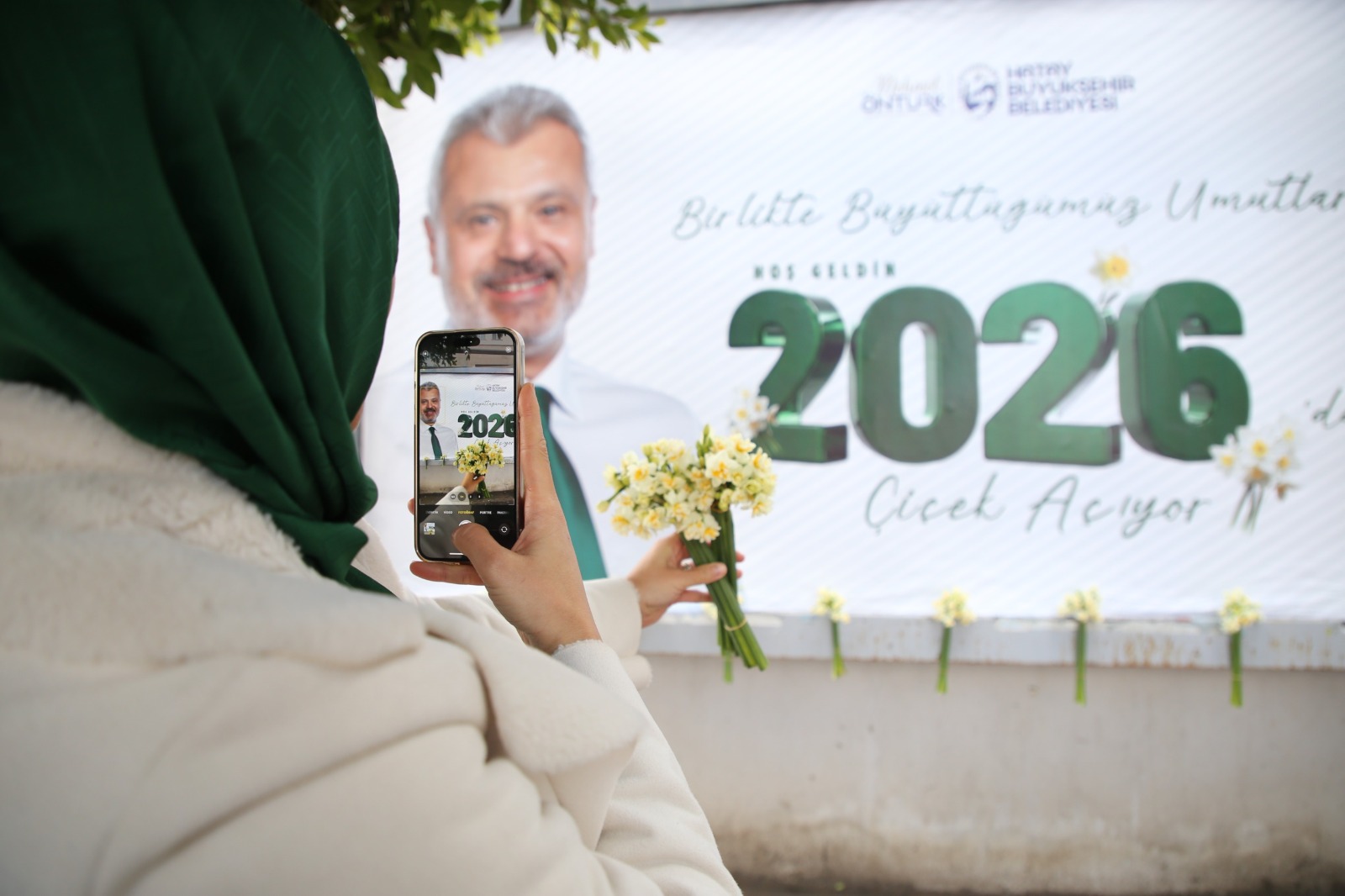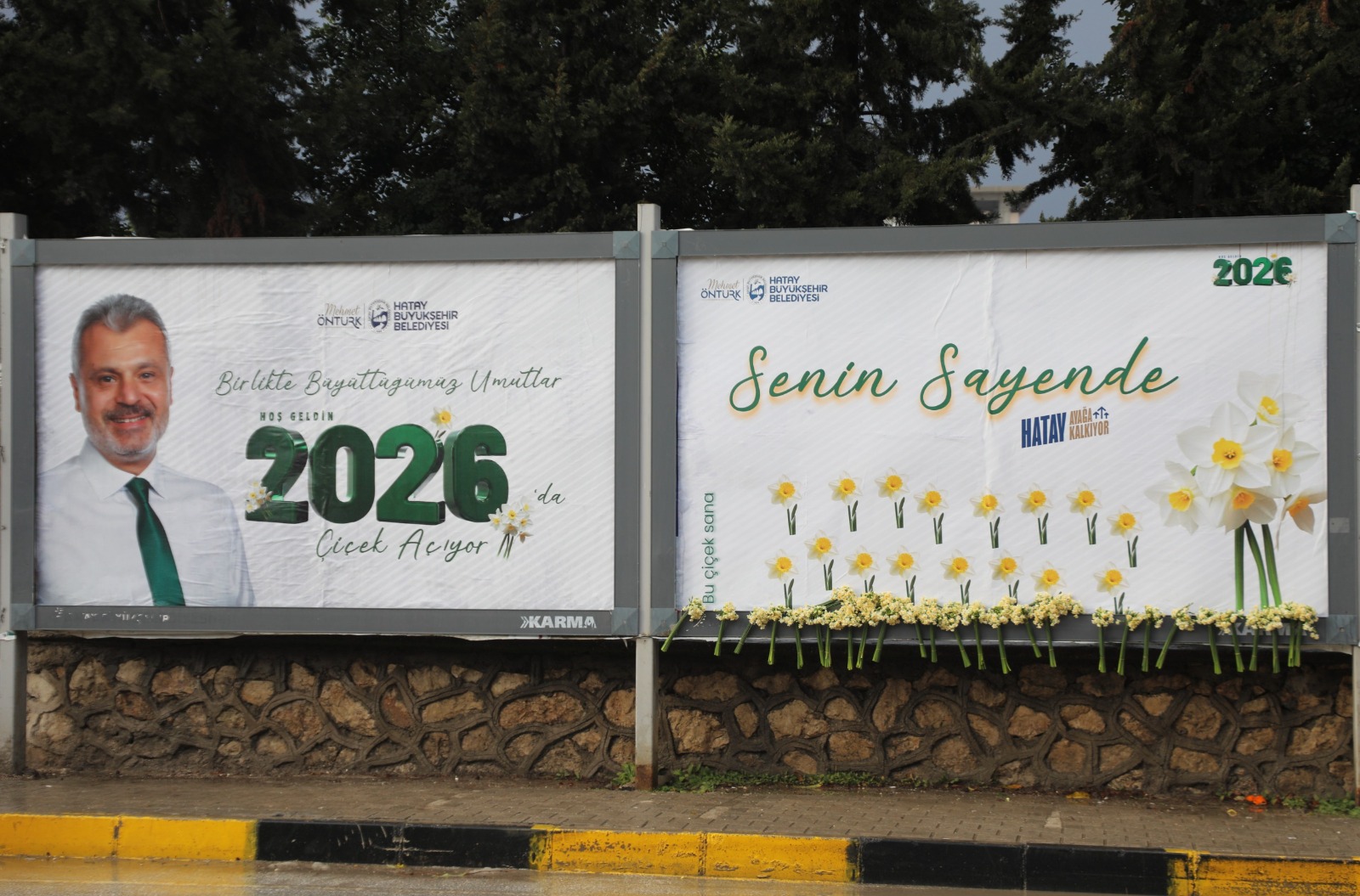 HBB ekipleri, şehrin faklı noktalarında bulunan billboardlarda HBB Başkanı Mehmet Öntürk’ün “Birlikte Büyüttüğümüz Umutlar 2026’da Çiçek Açıyor” yazılı tebrik mesajlarının olduğu görsellerin üzerine Hataylı vatandaşlara yılbaşı hediyesi olarak demet demet nergis çiçekleri yerleştirdi.
