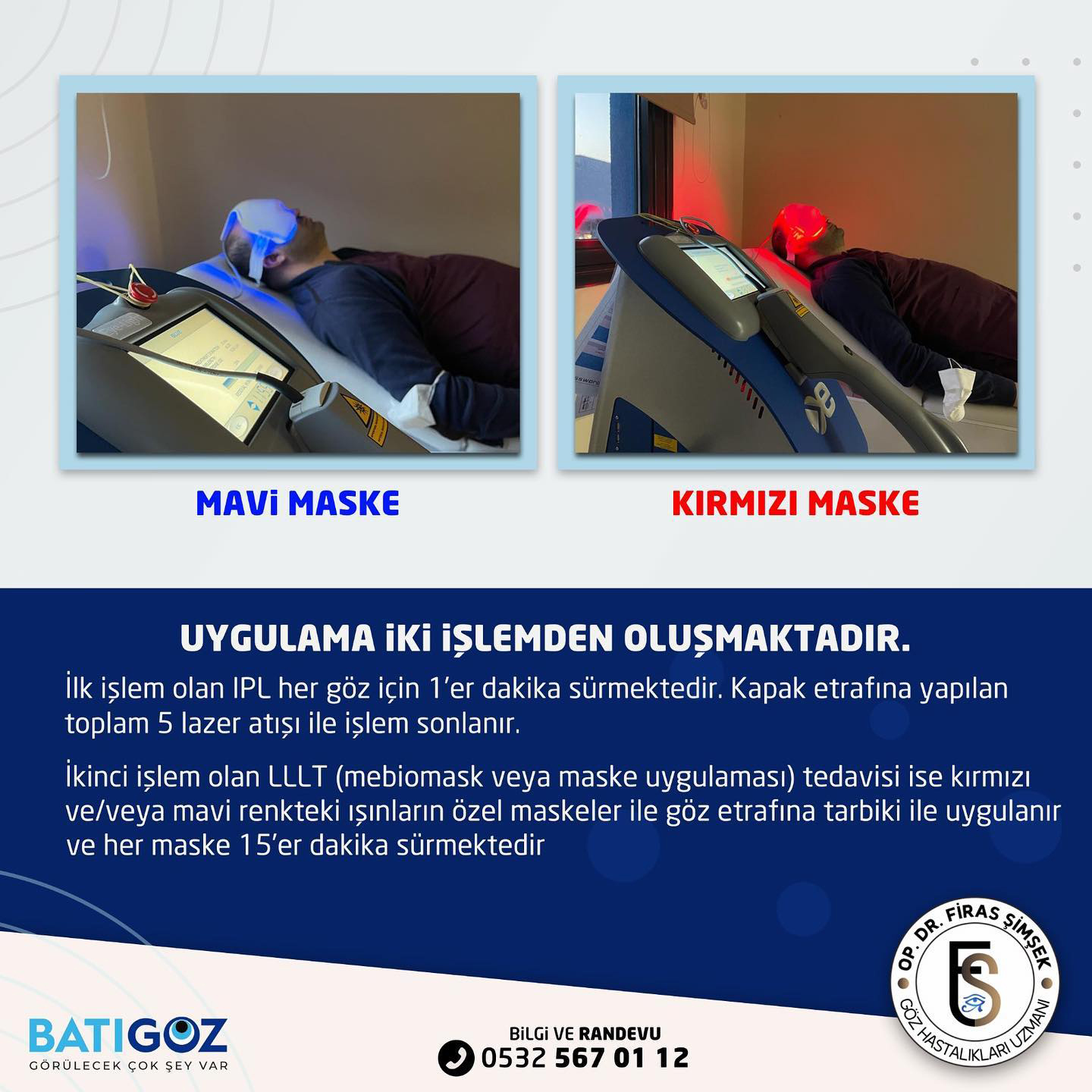 İkinci işlem olan LLLT (mebiomask veya maske uygulaması) tedavisi ise kırmızı ve/veya mavi renkteki ışınların özel maskeler ile göz etrafına tarbiki ile uygulanır ve her maske 15’er dakika sürmektedir. İşlem sonrası günlük hayata çok çabuk dönülür.” (Haber: İlyas Edip TERBİYELİ)