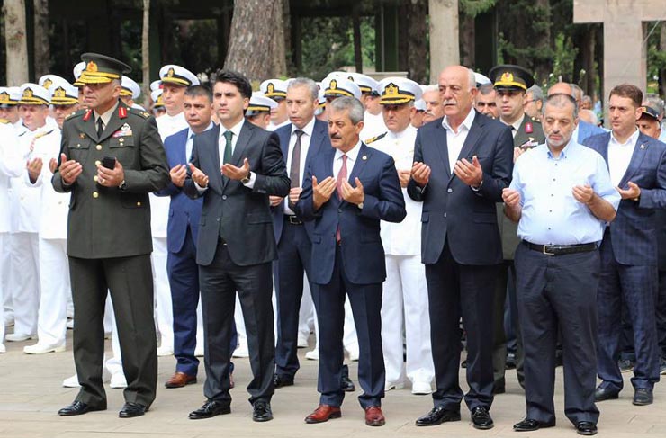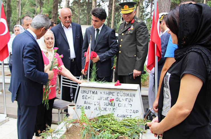 Şehitlikteki ziyarette ilk olarak saygı duruşunda bulunuldu ve akabinde istiklal marşımız okundu. Daha sonra Kur-an-ı Kerim okundu ve şehitlerimiz için dua edildi. Şehitlerin kabrine karanfil bırakan protokol üyeleri, şehit ailelerinin bayramlarını kutladı. (Haber: Doğan SÜSLÜ)