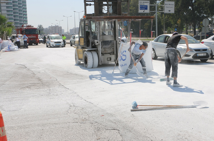 HBB Çevre Koruma ve Kontrol Daire Başkanlığına bağlı çevre mühendisleri olay yerinde yaptıkları incelemede ürünün zehirli bir kimyasal madde olmadığını ve insan sağlığını olumsuz etkileyecek bir etken oluşturmadığını belirledi. Yol temizleme çalışmalarının bitmesiyle birlikte Hatay Büyükşehir Belediyesi İtfaiye ekipleri yolu yıkayarak trafiğe açtılar.