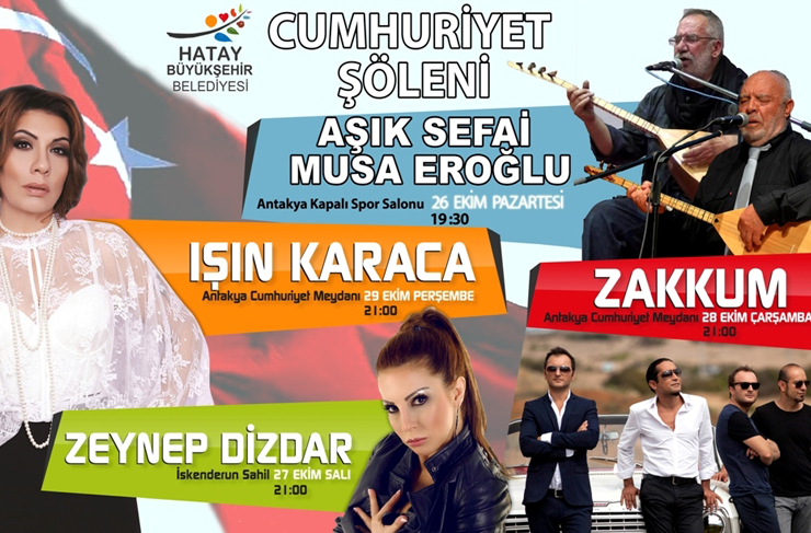 26 Ekim 2015 Pazartesi saat 19.30’da Âşık Sefai ve Musa Eroğlu Cumhuriyet Konseri, 27 Ekim 2015 Salı günü saat 21.00’da Zeynep Dizdar-İskenderun Sahili, 28 Ekim 2015 Çarşamba günü saat 21.00’da Zakkum-Antakya Cumhuriyet Alanı, 29 Ekim 2015 Perşembe günü saat 21.00’da Işın Karaca-Antakya Cumhuriyet Alanı.