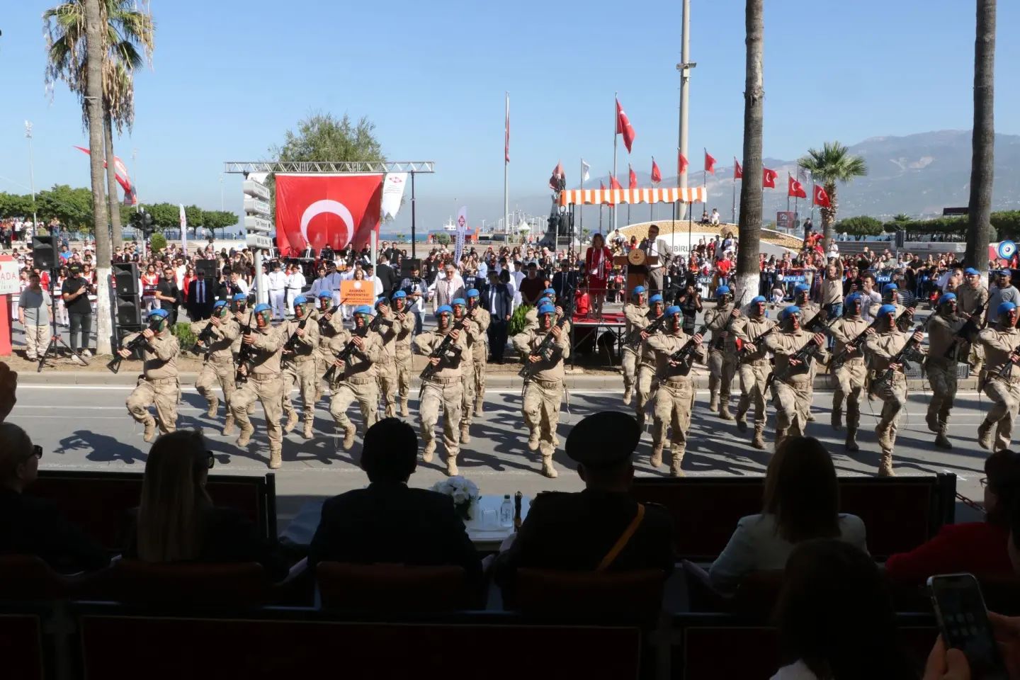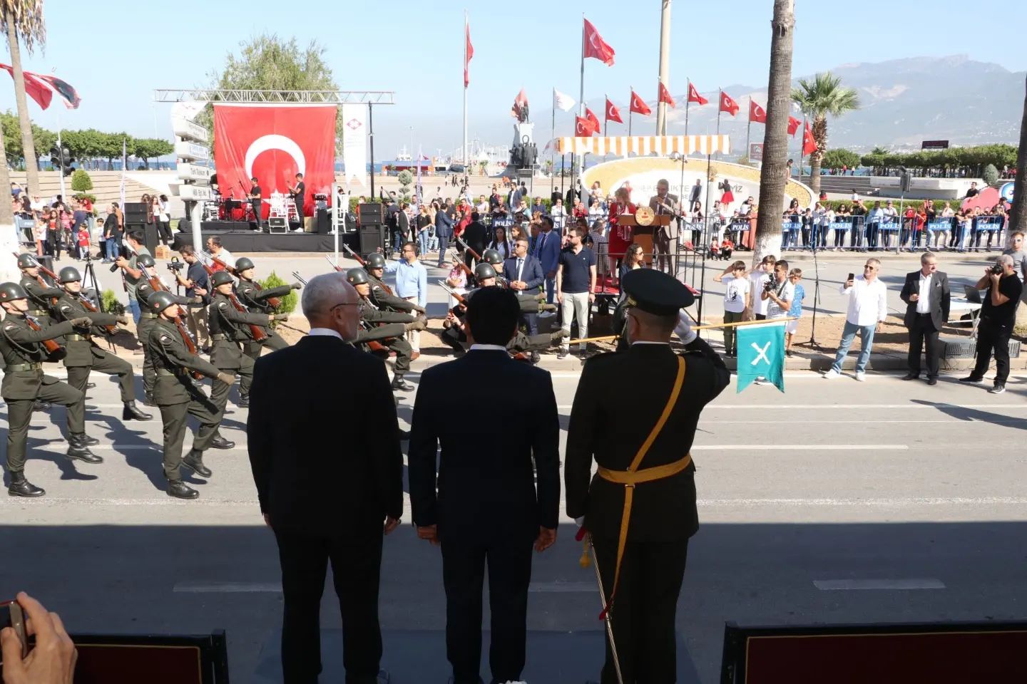 İskenderun Sahilinde Atatürk Bulvarındaki tören alanında İskenderun Kaymakamı Murat Sefa Demiryürek, İskenderun 39’uncu Mekanize Piyade Tugay Komutanı ve Garnizon Komutanı Tuğgeneral Hakan Tutucu ve İskenderun Belediye Başkanı Fatih Tosyalı vatandaşların 29 Ekim Cumhuriyet Bayramını kutladı.