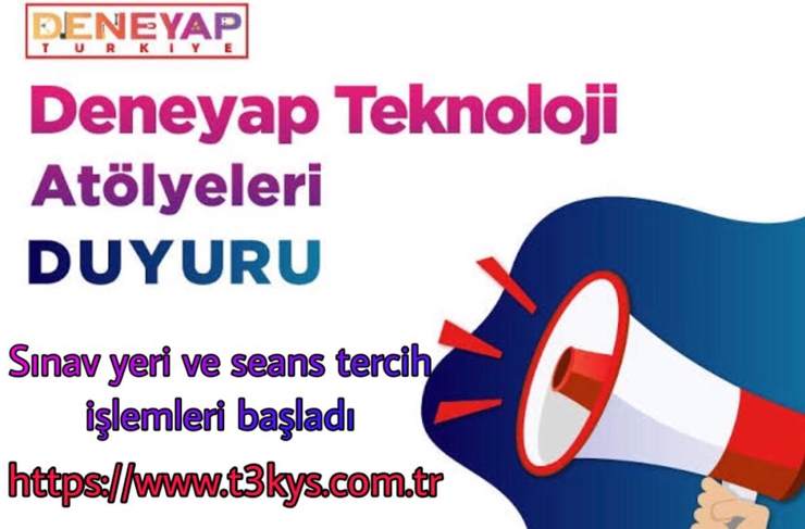 Deneyap Türkiye Teknoloji Atölyelerine ön başvurusu onaylanan adayların sınav yeri tercih işlemlerini tamamlamaları için son gün 7 Ekim 2021.. Adayların başvuru sürecini ve seans seçim işlemleri için KYS (Kurumsal Yönetim Sistemi) https://www.t3kys.com/ üzerinden mutlaka takip etmeleri gerekmektedir. Ön başvurusunu tamamladıktan sonra sınav salonu ve sınav saatini seçen adayların başvuru aşaması tamamlanmış olup, sınav tarihini beklemeye koyulacaklar.