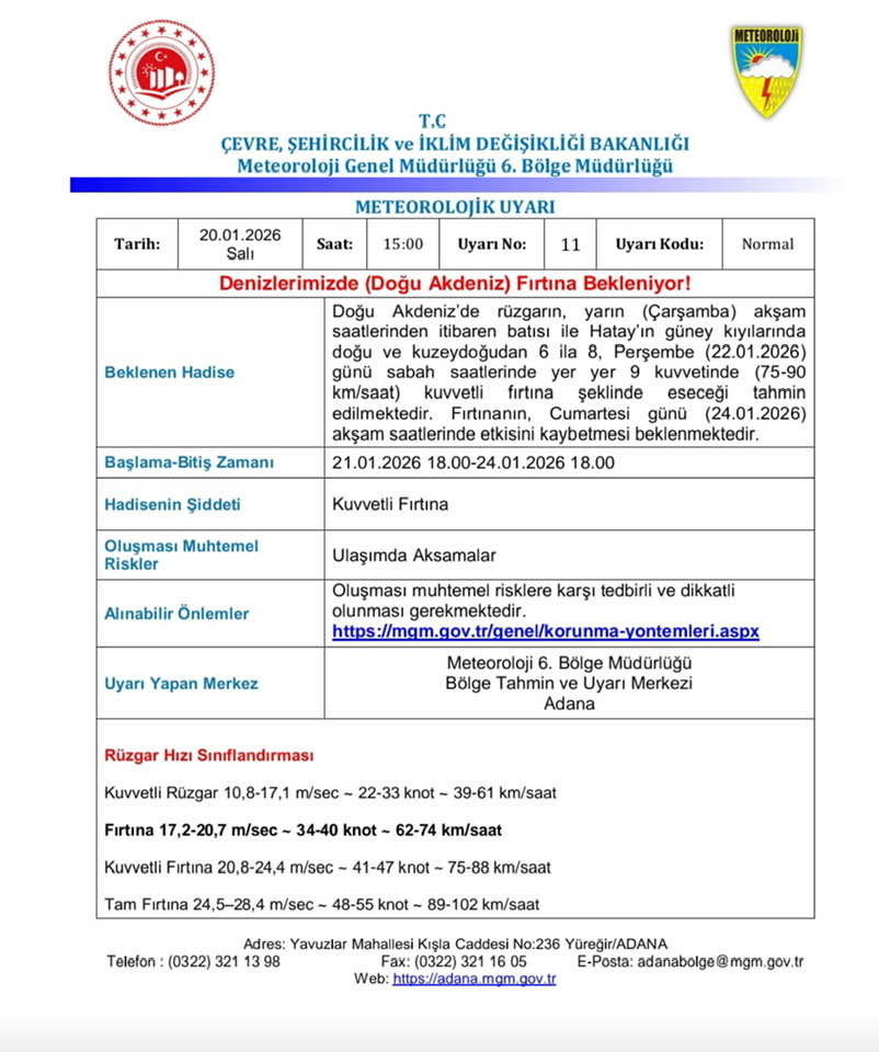 Uyarıya göre, 21 Ocak Çarşamba günü akşam saatlerinden itibaren Doğu Akdeniz’de rüzgârın batı ile Hatay’ın güney kıyılarında doğu ve kuzeydoğudan, Perşembe sabah saatlerinden itibaren ise yer yer 9 kuvvetinde (75-90 km/saat) kuvvetli fırtına şeklinde eseceği tahmin ediliyor.