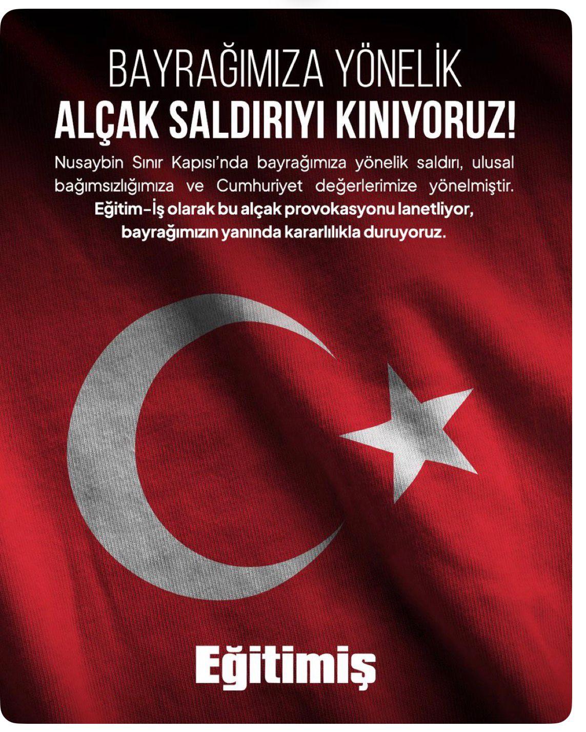 Nusaybin Sınır Kapısı’nda Türk bayrağına yönelik gerçekleştirilen saldırıya Eğitim ve Bilim İşgörenleri Sendikası (Eğitim-İş) sert tepki gösterdi. Sendika tarafından yapılan yazılı açıklamada, söz konusu saldırının Cumhuriyet değerlerini ve ulusal bağımsızlığı hedef aldığı vurgulandı.