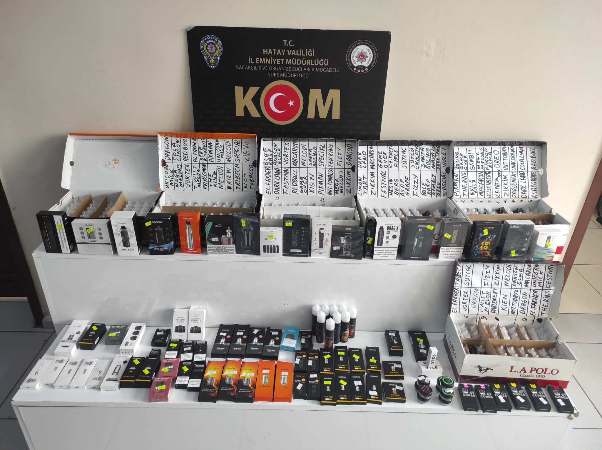 Hatay Emniyet Müdürlüğü görevlilerinin kaçakçılık suçlarının önlenmesine yönelik yaptığı çalışmalar kapsamında 21/03/2022 günü Antakya Akasya Mahallesinde bulunan bir işyerinde de aramalar yapıldı. Burada da 18 adet Elektronik Sigara, 282 adet Elektronik Sigara Likiti ve 42 kutu Elektronik Sigara parçaları ele geçirildi. Olayla ilgili B.A. yakalanırken, şüpheli hakkında 5607 SKM suçundan adli işlem yapıldı. (Haber Merkezi)