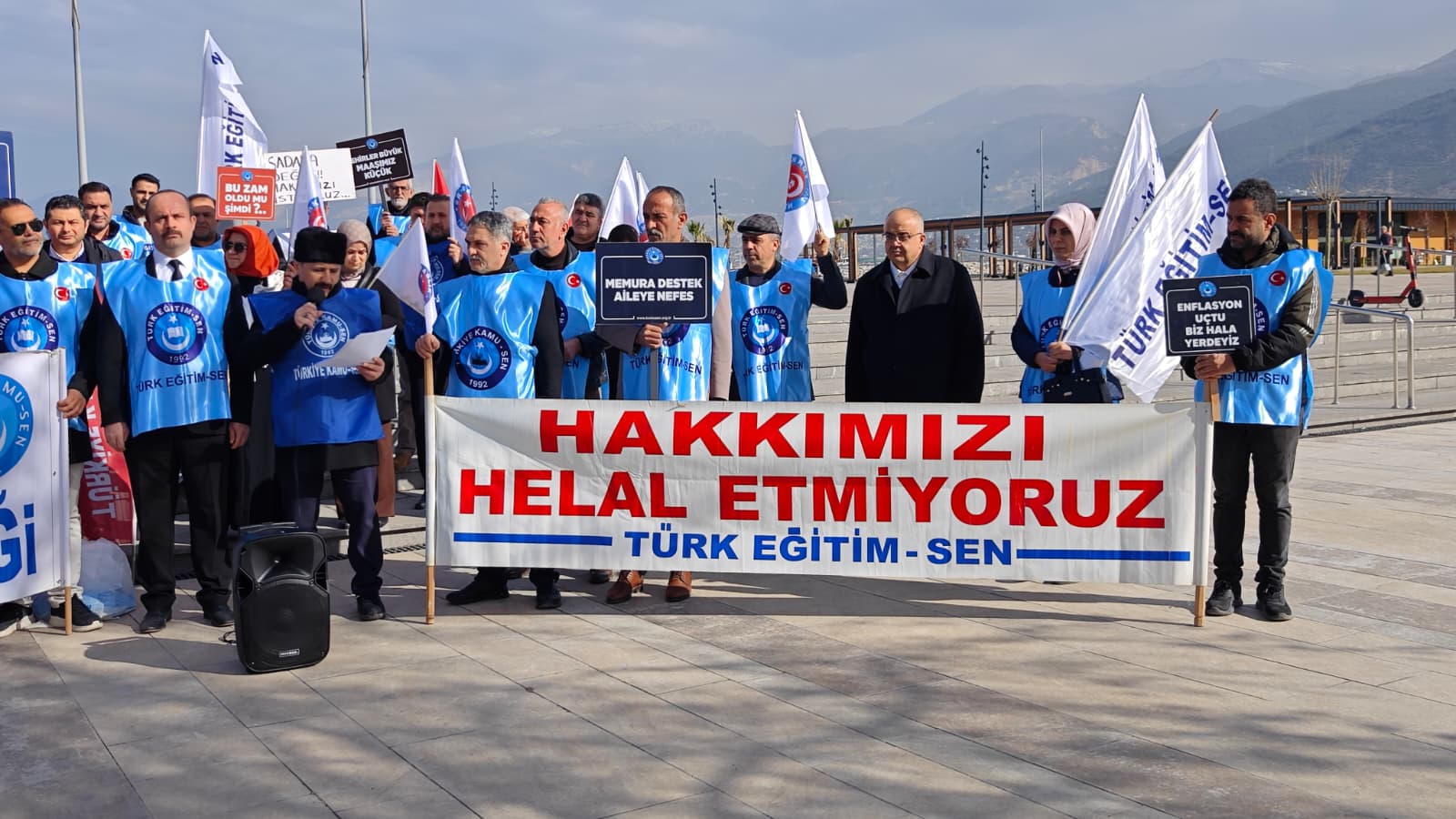 Basın açıklamasını ise Türk Eğitim-Sen Hatay 1 Nolu Şube Başkanı Ali Akpınar yaptı. Akpınar, soğuk havaya rağmen alana gelen kamu çalışanlarına ve basın mensuplarına teşekkür ederek konuşmasına başladı.