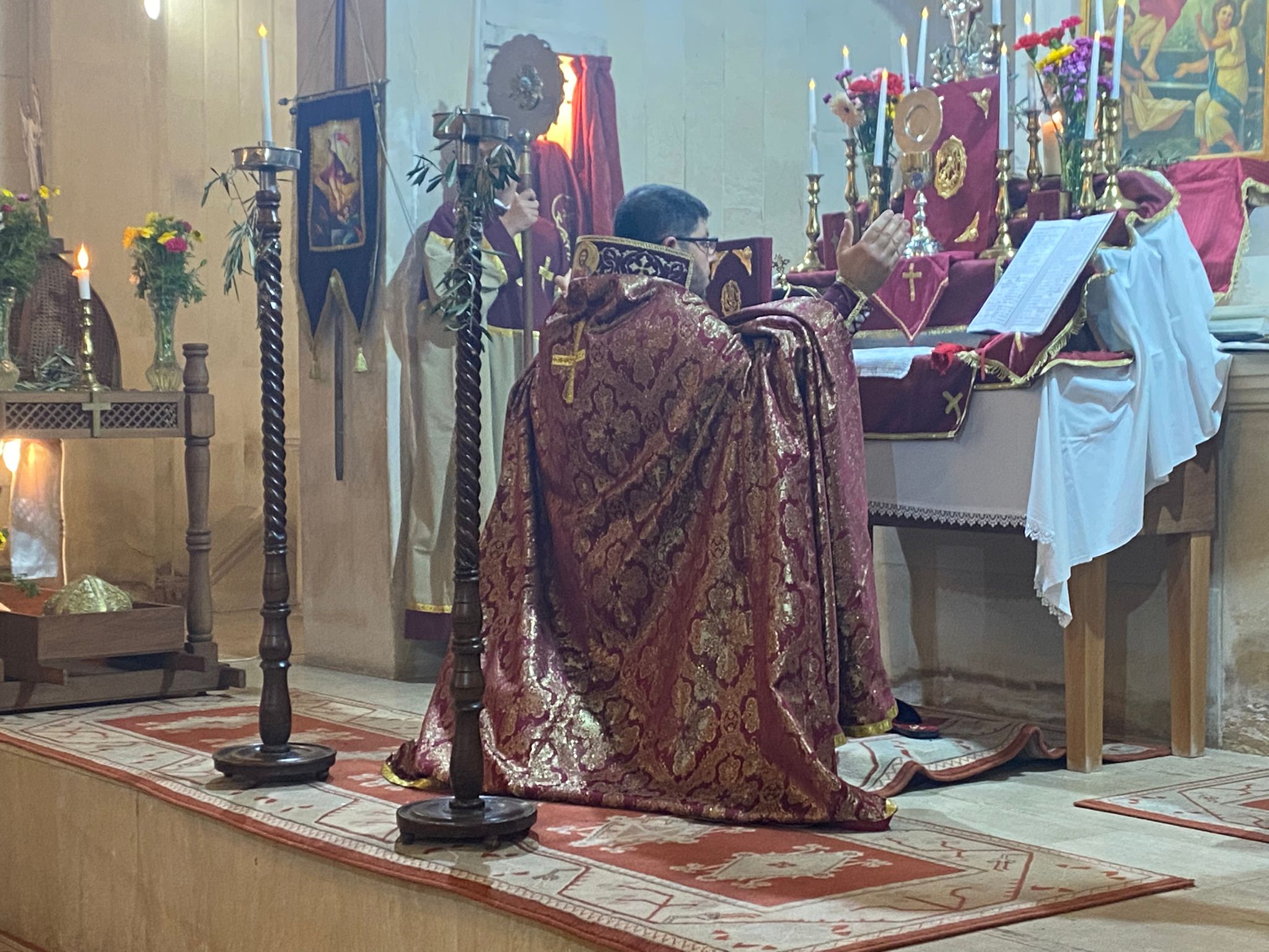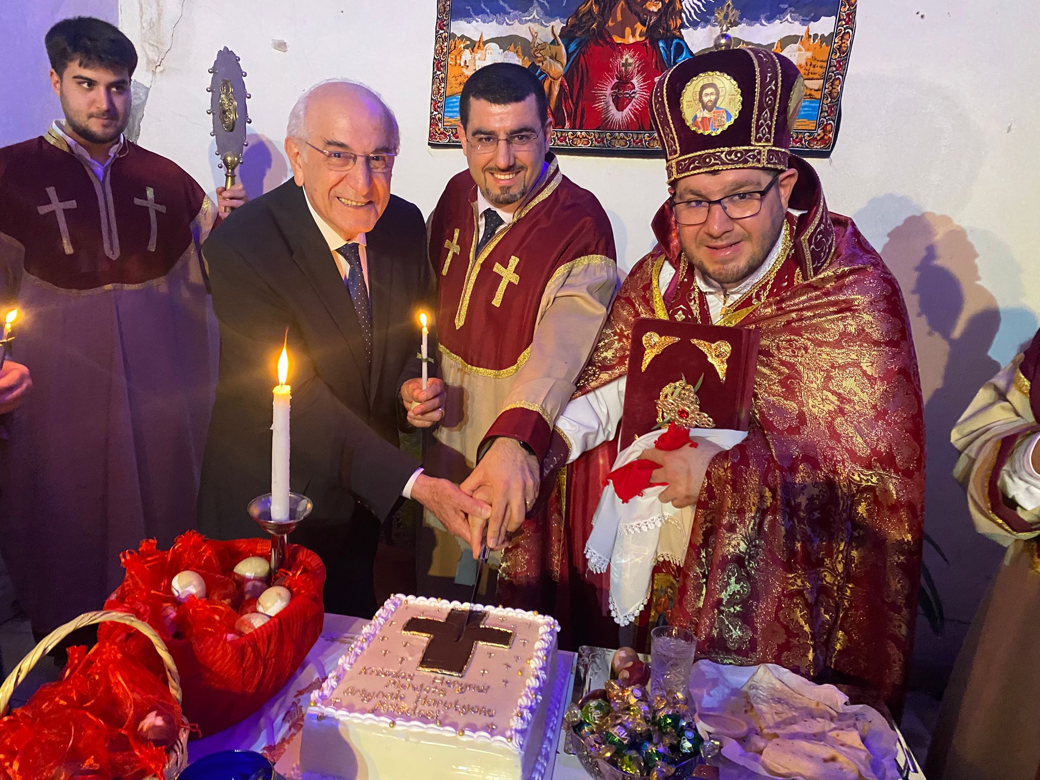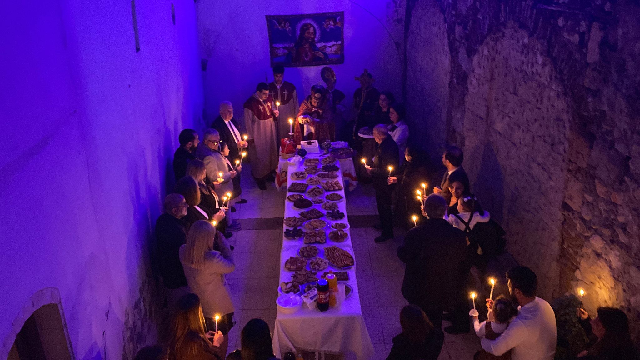 Ayin sırasında kilisenin ışıklarının söndürülmesiyle Peder Tabaşyan’ın elindeki mumdan, mumlarını yakan cemaat karanlığı aydınlatırken, ilahiler eşliğinde kilise bahçesine geçildi. Peder Tabaşyan, kilise bahçesinde ilahiler eşliğinde ekmek, yumurta, su ve tuzu kutsadı.