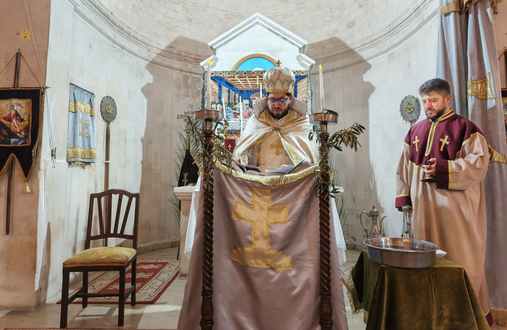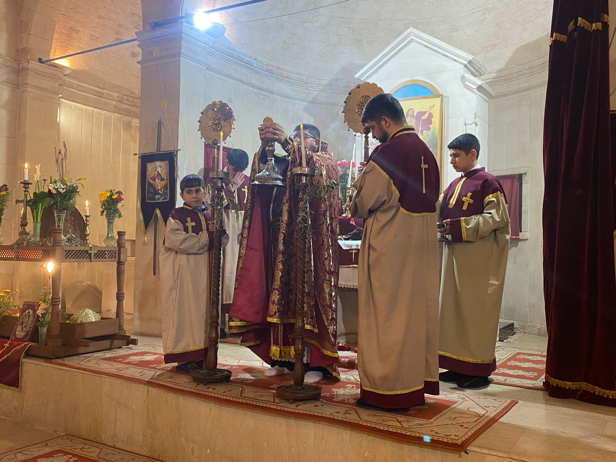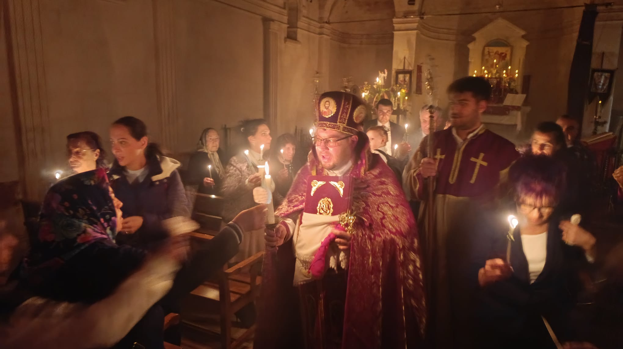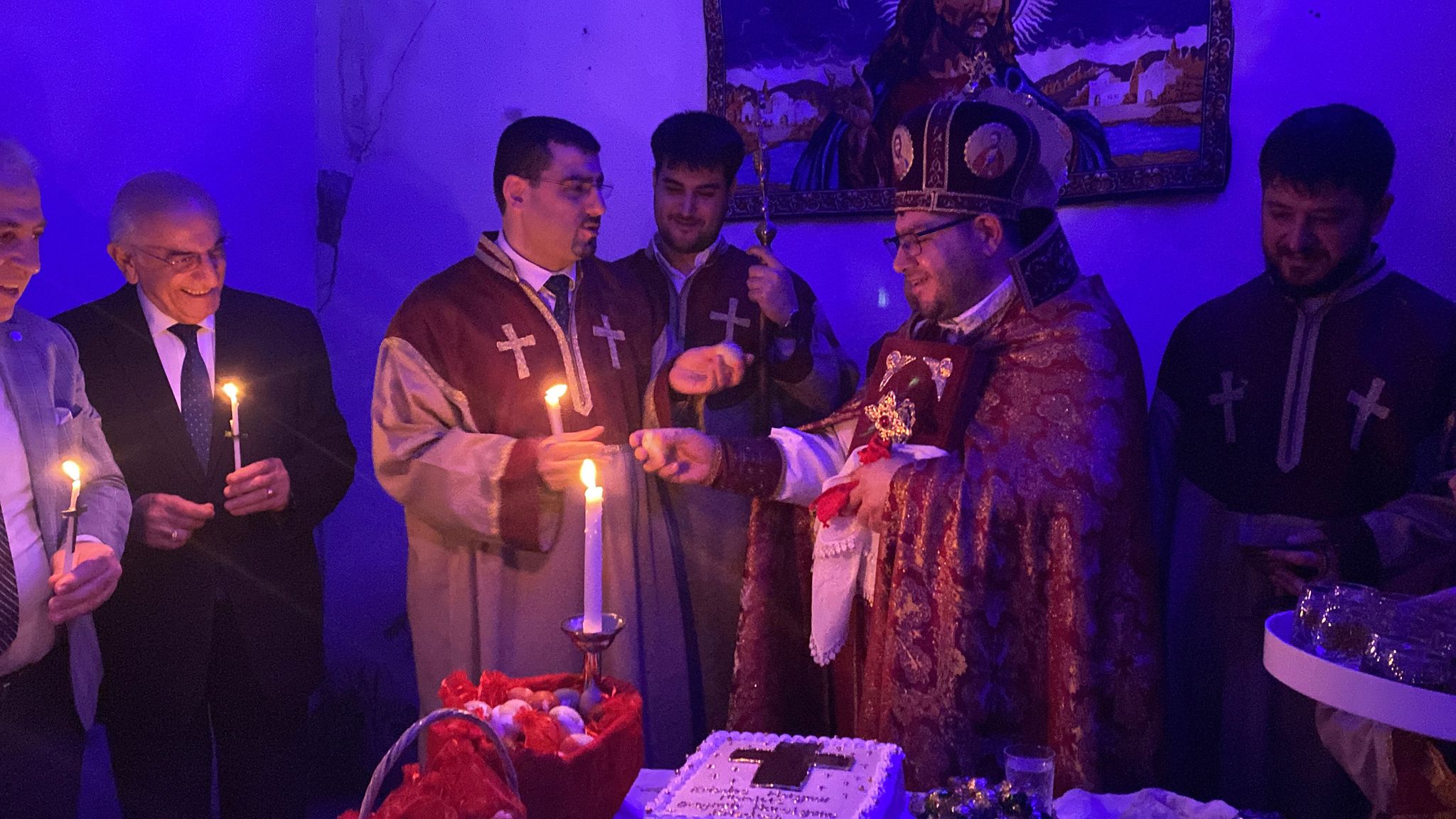 Ayin sırasında kilisenin ışıklarının söndürülmesiyle Peder Tabaşyan’ın elindeki mumdan, mumlarını yakan cemaat karanlığı aydınlatırken, ilahiler eşliğinde kilise bahçesine geçildi. Peder Tabaşyan, kilise bahçesinde ilahiler eşliğinde ekmek, yumurta, su ve tuzu kutsadı.