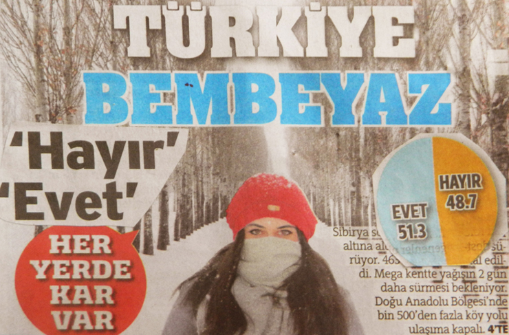 Şubat ayında hemen-hemen tüm Türkiye kar ile kaplanmış ve her yer kar dolayısıyla bembeyazdı! ’16 Nisan’ Halk Oylaması içinse bazı basın kuruluşları ‘Referandum Hava Tahminlerini’ sunarken, yatsıya kadar Türkiye’nin baştanbaşa ‘Beyaz’ ile kaplanacağını belirtmişlerdi. Gün aydınlanırken Türkiye’nin sadece yarısından bir fazlasının ‘Beyaz’ ile kaplandığı, yarıya yakınının ise ‘Kahverengi’ toprak kaldığı anlaşıldı. Ayni anlayacağınız; Tahminler ‘Yatsıya’ kadar sürmüş!