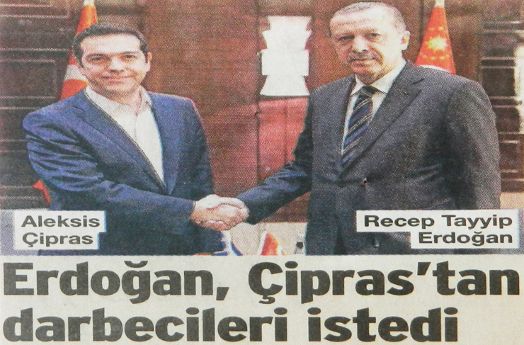Recep Tayyip ERDOĞAN (Cumhurbaşkanı): “Çipras’a biraz nasihat çektim. 1967 yılında darbe yapan ‘Albaylar Cuntası’nın ‘Kıbrıs Barış Harekâtıyla’ Türkiye’nin sayesinde devrildiğini, Yunanistan’a demokrasi geldiğini hatırlattım. O dönemlerde Albaylar Türkiye’ye sığınsaydı tereddüt etmeden iade edeceğimizi belirttim. Yunanistan’a sığınan ‘Darbeci FETÖ’cülerin’ iadelerini talep ettim. Hiç oralı olmadı! Çipras’ın siyasette henüz ‘Çıraklık’ dönemini atlatamadığı kanaatine vardım.”