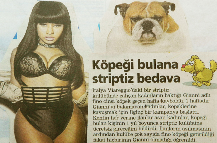 Köpek: “Sahibim kafayı üşütmüş! Her gün striptiz yapmadan rahatlayamıyor, strese giriyor. Beni parklarda terk ediyor, sonra gazetelere ‘Köpeğim Kayboldu’ ilanı veriyor. Beni bulup sahibime teslim edenlere mükâfat olarak iki saat ‘striptiz’ bahislion yapıyor. ‘Kayıp Numarasını’ her fırsatta sık-sık tekrarlıyor. Ben de her gün ‘Kaybolmaktan’ bıktım. Hayvanat Bahçesinde yaşamaya razıyım.”