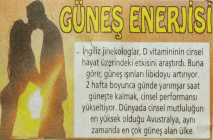 İngiliz bilim adamlarının araştırmalarına göre ‘Güneş Işınları’ cinsel performansı yükseltiyor. 2 haftada boyunca günde yarımşar saat güneşlenmek yeterliymiş. ‘Performansın’ reçetesi güneşlenmekmiş, bedavaya ‘Yenilenebilir’ Enerji! Bu gidişle piyasada satılan ‘performans’ artırıcı haplara ve kremlere gerek kalmayacak.