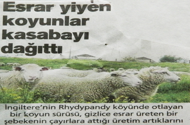 İngiltere’de bir köyde “otlayan” koyunlar, bir tarlada “gizlice üretilen esrardan” yiyince esrarın etkisiyle kafayı bulup kasabayı birbirine katarak ortalığı dağıttılar… Koyunlar; ”Bizi zoraki olarak “uyuşturucuya” alıştıracaklar. Dağ, taş her yer uyuşturucudan geçilemiyor. Ellerinden gelse, asfaltlı yollara da “esrar ekip” insanları zehirleyecekler.”