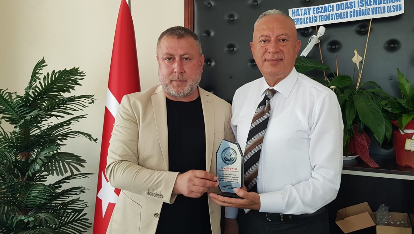 Yapılan ziyarette, Akdeniz Eczacı Teknisyenleri Federasyonu Başkanı Cemal Çelik, Gazeteciler Cemiyeti Başkanı Diyap Atar’a şehre katkılarından dolayı teşekkür plaketi verdi. (Haber Merkezi)
