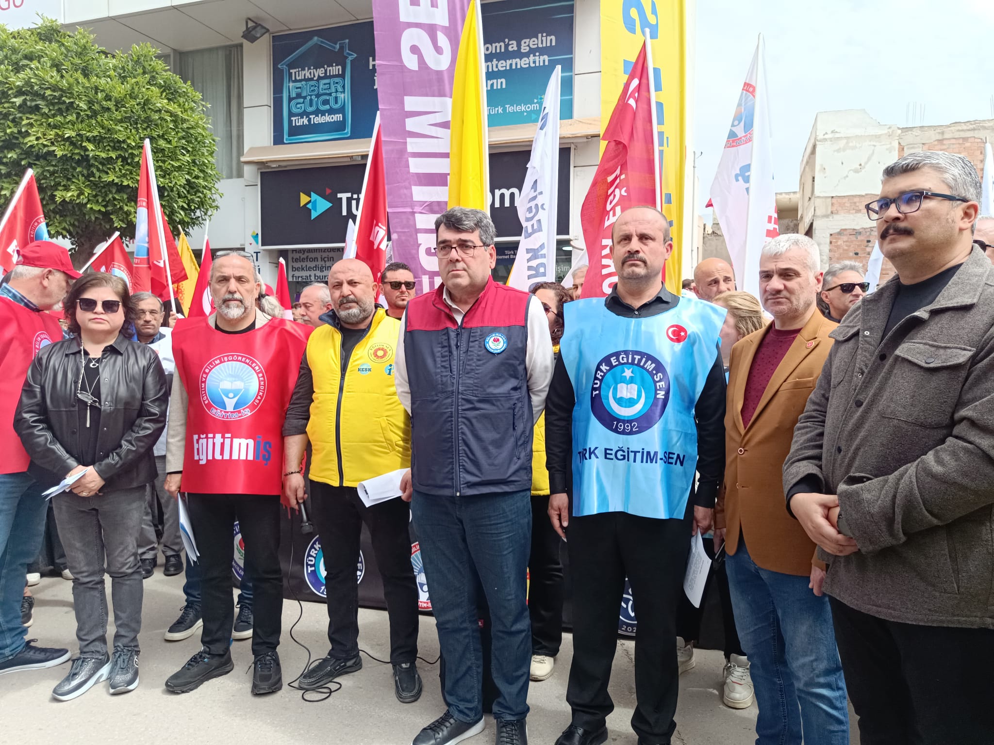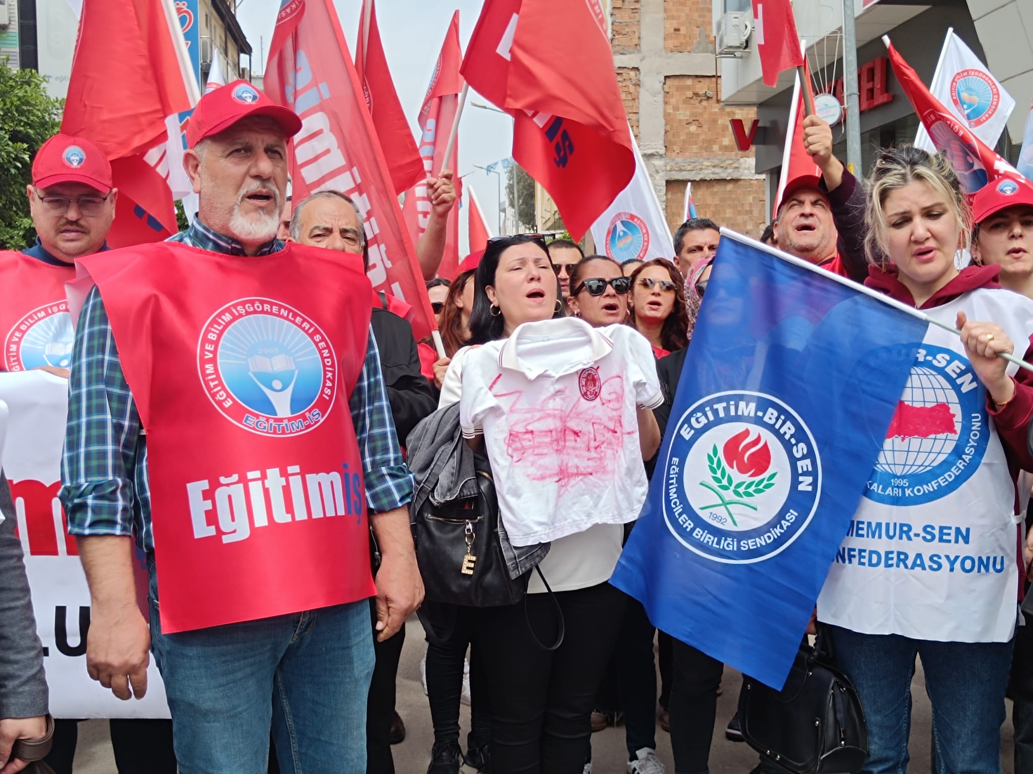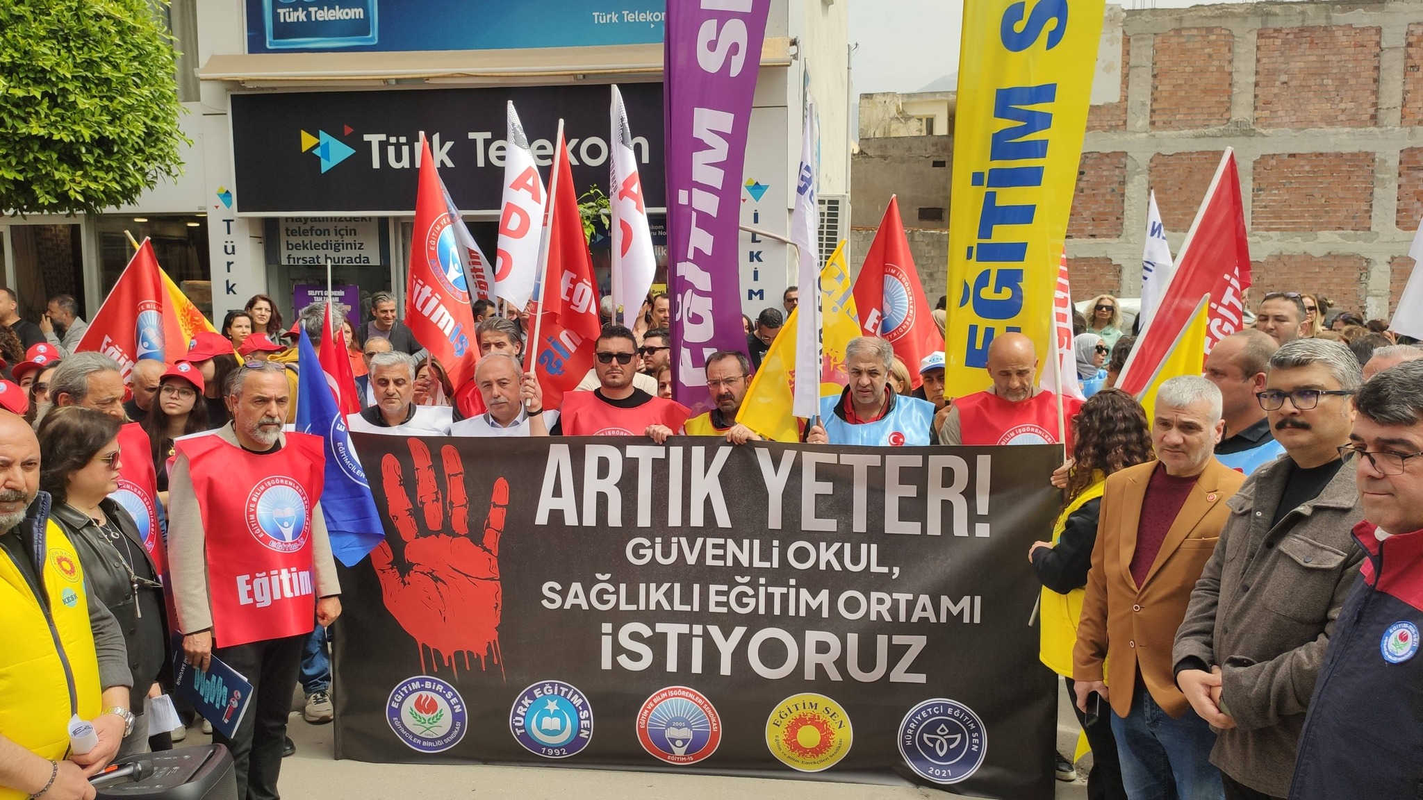 Türk Eğitim-Sen, Hürriyetçi Eğitim Sen, Eğitim-İş, Eğitim Bir Sen ve Eğitim Sen temsilcilerinin katıldığı açıklamada sık sık “Korku Değil Güvenli Okul”, “Şiddete Hayır”, “Şiddete Ceza Öğretmene Güvence”, “Yusuf Tekin İstifa” sloganları yükseldi. Sendikalar, eğitim kurumlarının giderek daha güvensiz hale geldiğini ve bu durumun yalnızca eğitimcilerin değil tüm toplumun sorunu olduğunu vurguladı.