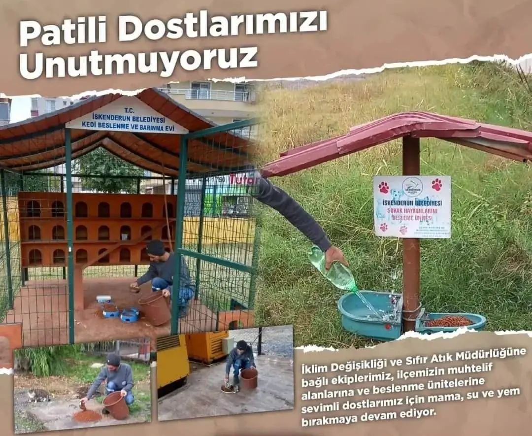 İskenderun Belediyesi İklim Değişikliği ve Sıfır Atık Müdürlüğüne bağlı ekipler yiyecek bulmakta güçlük çeken sokak hayvanları için düzenli olarak besleme çalışması yapıyor.
