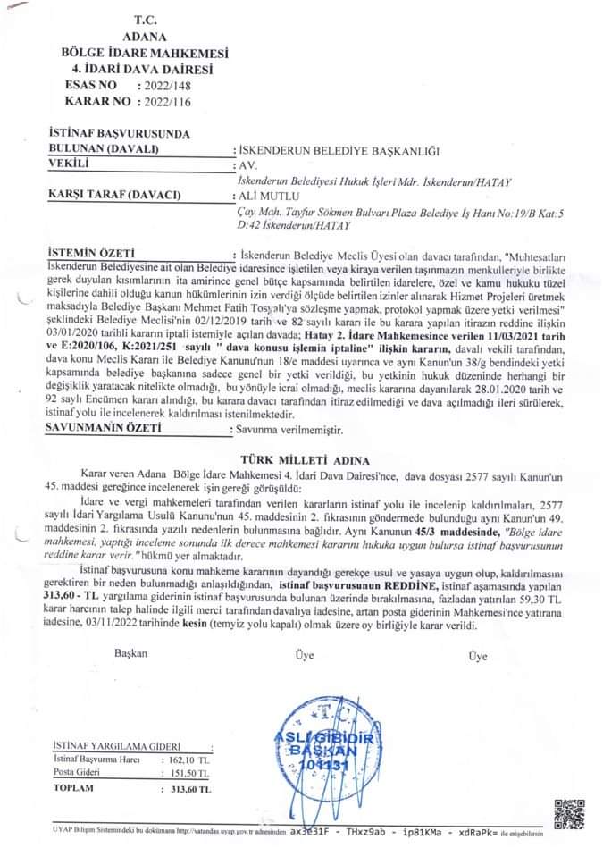 Adana Bölge İdare Mahkemesi (İstinaf) yapılan itirazın reddine ilişkin 03/01/2020 tarihli kararda ‘Hukuka uyarlık bulunmadığı sonucuna varılmıştır’ şeklindeki kararının gerekçe usul ve yasaya uygun olduğuna, İskenderun Belediye Başkanlığının istinaf başvurusunu REDDİNE karar verdi.