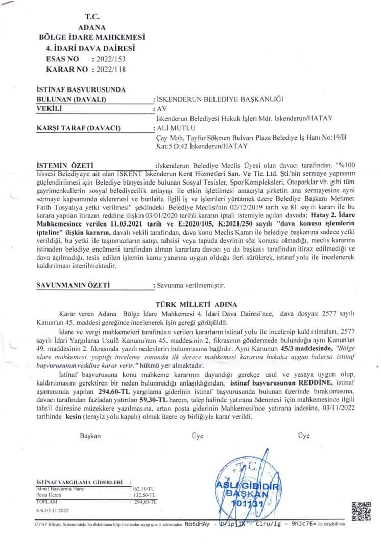 Adana Bölge Mahkemesi (İstinaf), İskenderun Belediyesi tarafından yapılan itiraz başvurusunu reddetti. Duruşmalar sonunda meclisin yetkilerinin devredilemeyeceği yönünde karar alınmış, Belediye Başkanlığı olarak da alınan karara itiraz edilmişti.