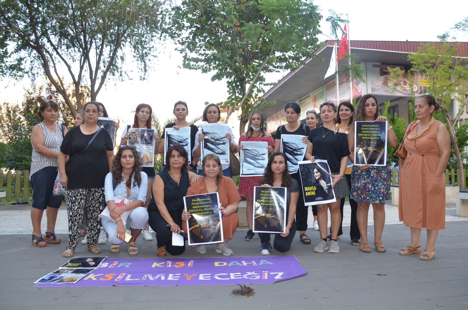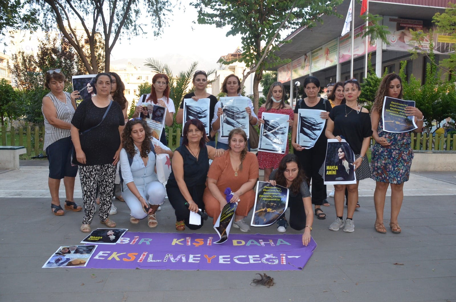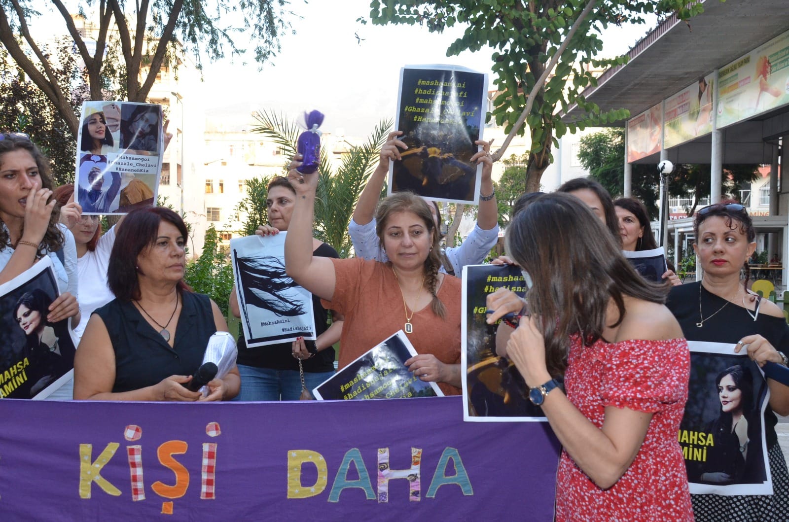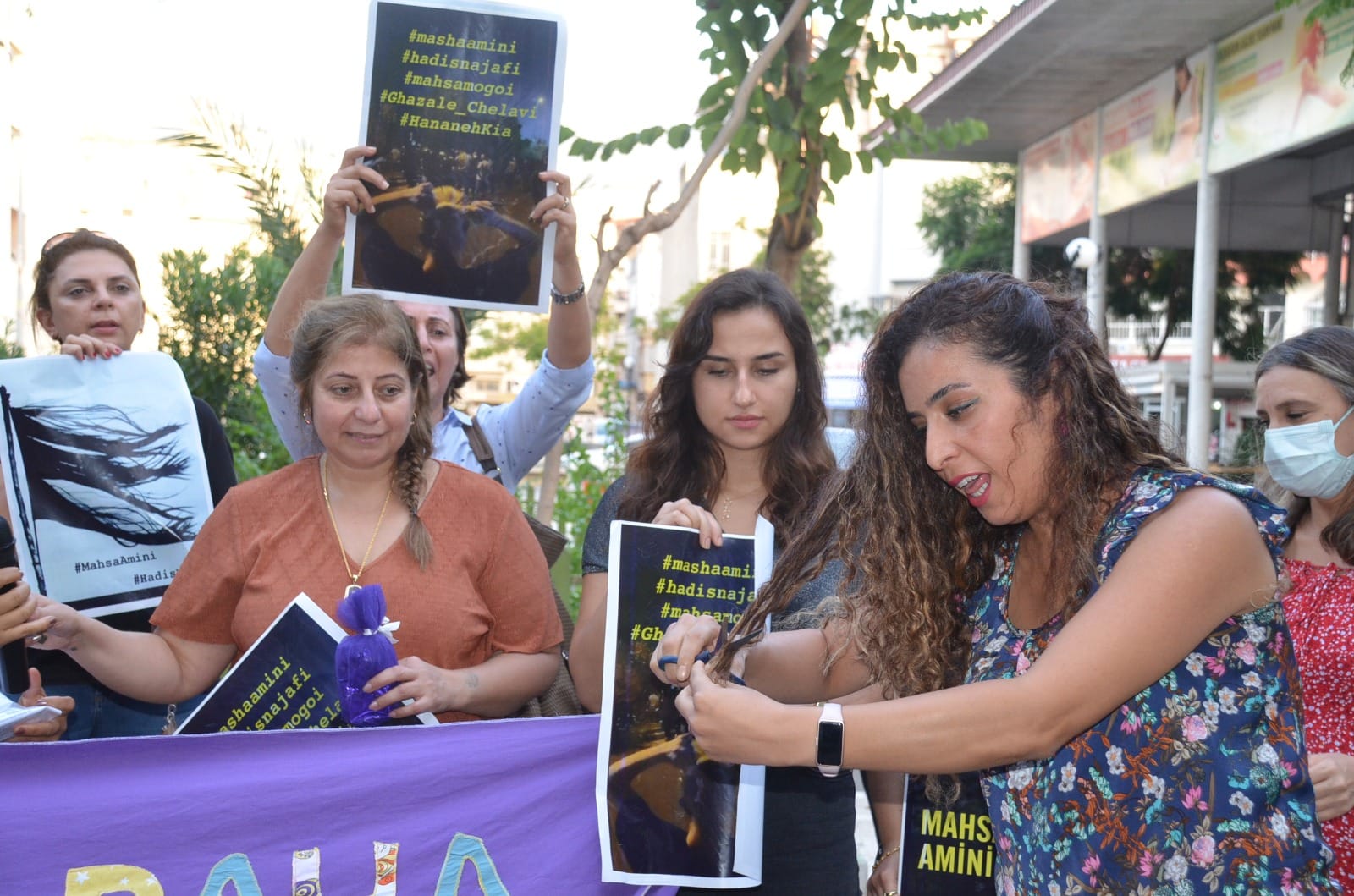 İskenderun Kadın Platformu, İran’da ahlak polisi tarafından kadınlara uygulanan şiddeti protesto etmek amacıyla bir araya gelerek, İranlı kadınlara gönderilmek üzere saçlarını sembolik olarak kesti.
