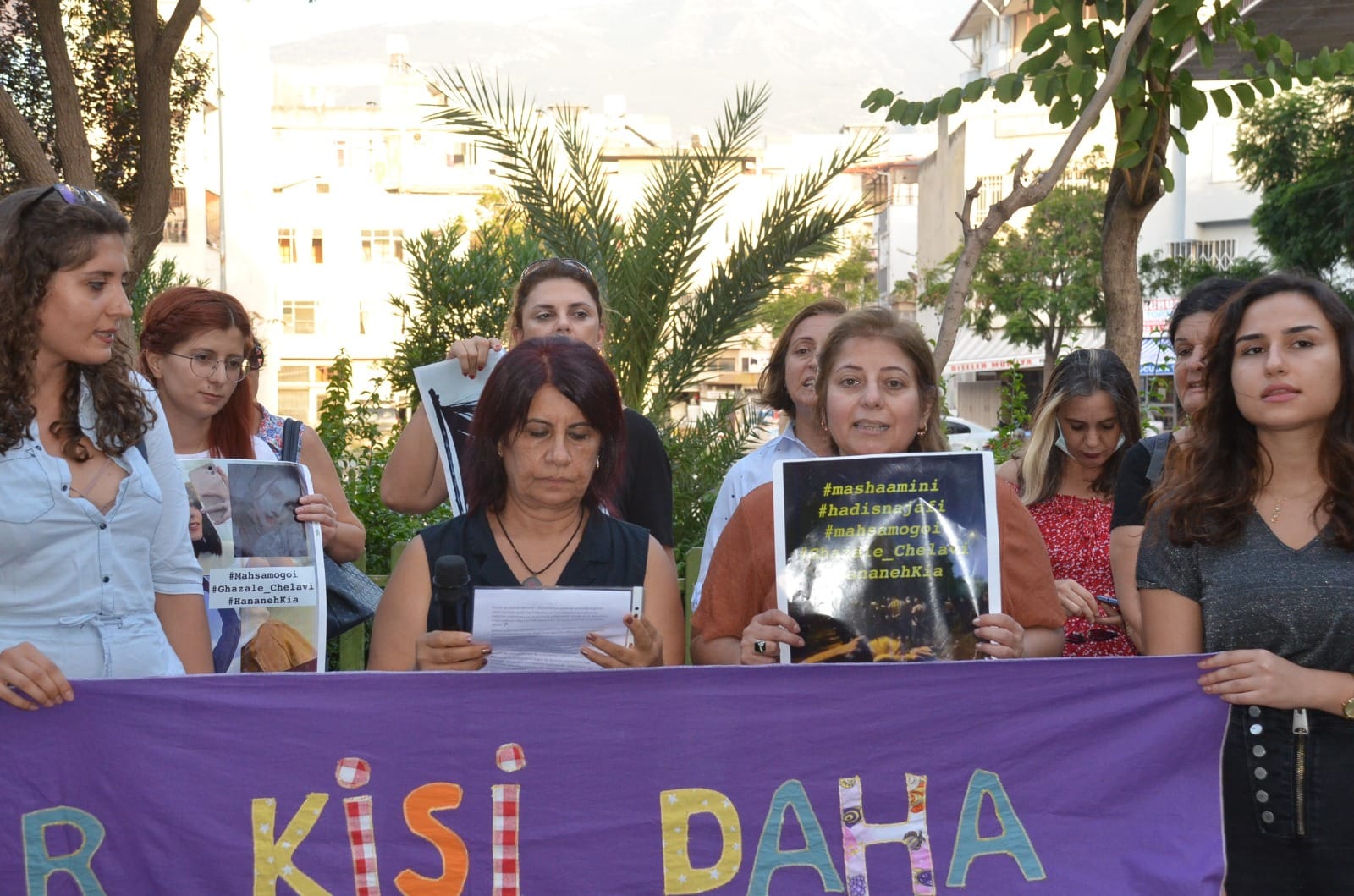 Üyeler adına konuşan İskenderun Kadın Platformu Sözcüsü Feyruz Gör, İranlı kadınların, haklarına ve yaşamlarına yönelik saldırılara karşı mücadele ettiğini hatırlatarak; “İktidarlarının giderek sarsıldığını gören rejim ve onun polisi ise kadınlara ve mücadelelerine saldırarak kadınları yıldırmaya ve sindirmeye çalışmaktadır. Direnen Hadis Necefi’de katledildi” dedi.