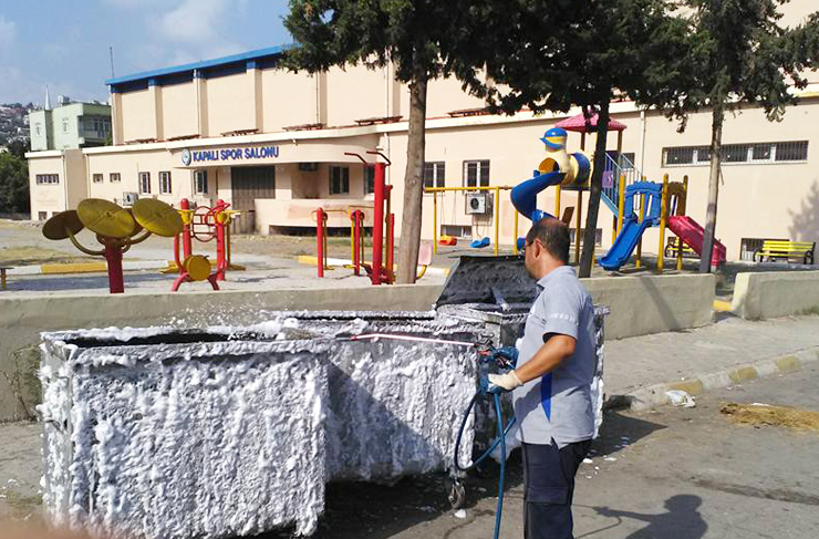 İskenderun Belediyesi Temizlik İşleri Müdürlüğü ekipleri pis koku ve haşerelere karşı şehirde bulunan çöp konteynerleri ilaçlı köpükleme sistemi ile dezenfekte etmeye devam ediyor.