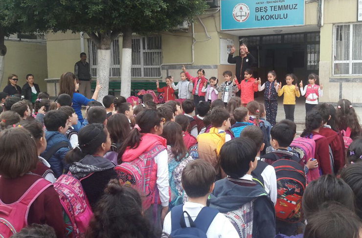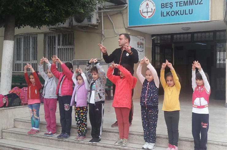 Beş Temmuz İlkokulu öğrencilerinden bir grup, Cuma günü okul çıkışı İstiklal Marşı söylenirken, arkadaşlarının karşısında durarak işaret diliyle onlara eşlik etti. İşaret diliyle İstiklal Marşını okuyan öğrenciler arkadaşlarında da büyük alkış aldı.