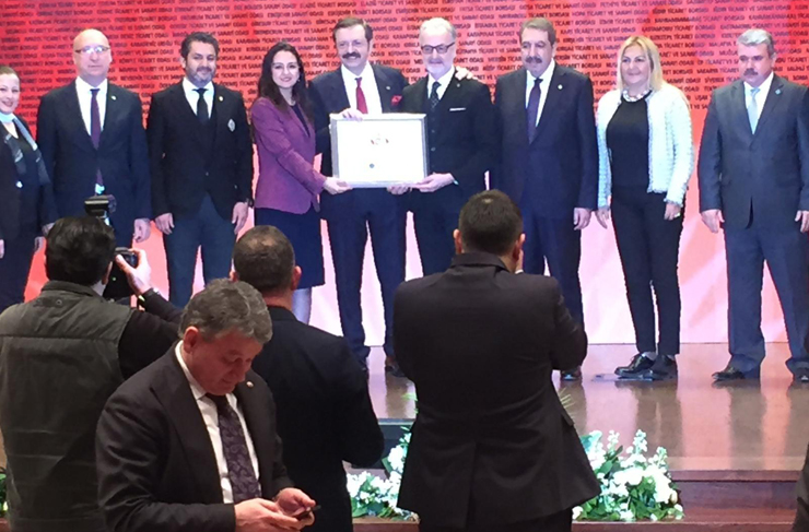 TOBB Başkanı Rifat Hisarcıklıoğlu, İTSO yönetimini tebrik ederek, Akreditasyon Sertifikasını takdim etti. (Haber Merkezi)