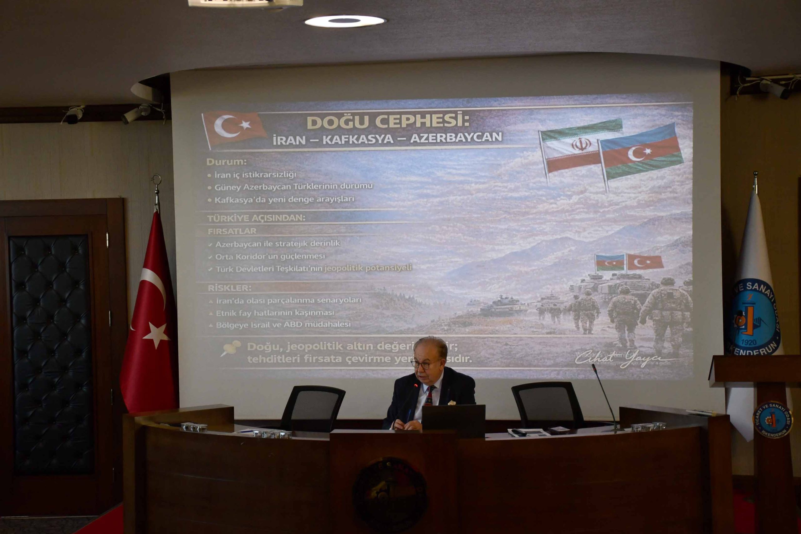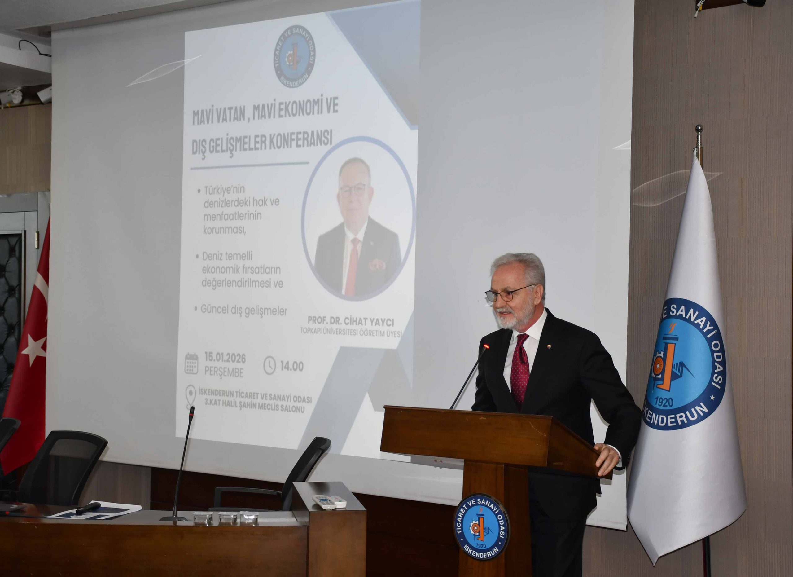 İskenderun Ticaret ve Sanayi Odası toplantı salonunda gerçekleştirilen “Mavi Vatan, Mavi Ekonomi ve Dış Gelişmeler” konulu programda, Müstafi Tümamiral Prof. Dr. Cihat Yaycı bilgi ve deneyimlerini katılımcılarla paylaştı.