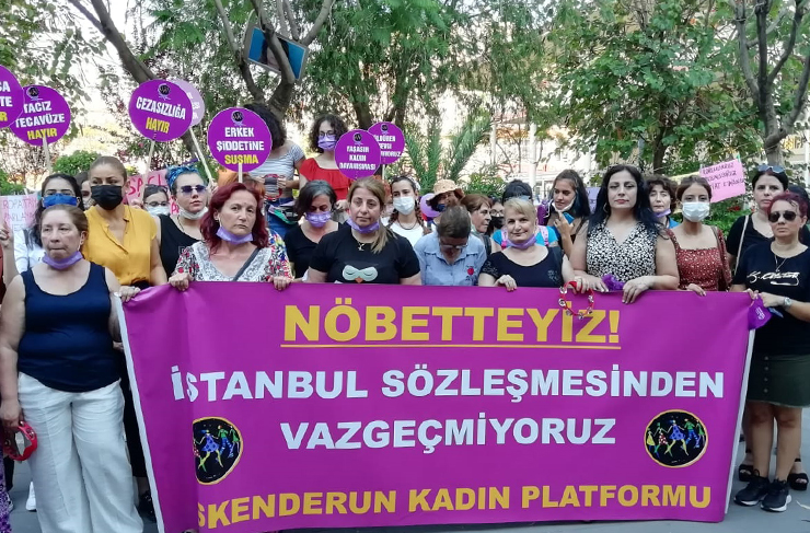 İskenderun Kadın Platformu Dönem Sözcüsü Mehtap Sert, her Perşembe gerçekleştirilen ‘Nöbet’ etkinliğinde İstanbul Sözleşmesinden tek taraflı olarak ayrılması konusunda yine basın açıklaması yaptı. Sert, İstanbul Sözleşmesinden geri adım atmanın, eşitlik, demokrasi ve hukukun üstünlüğünden geri adım atmak olduğuna işaret etti. Sert açıklamasında şunları söyledi;