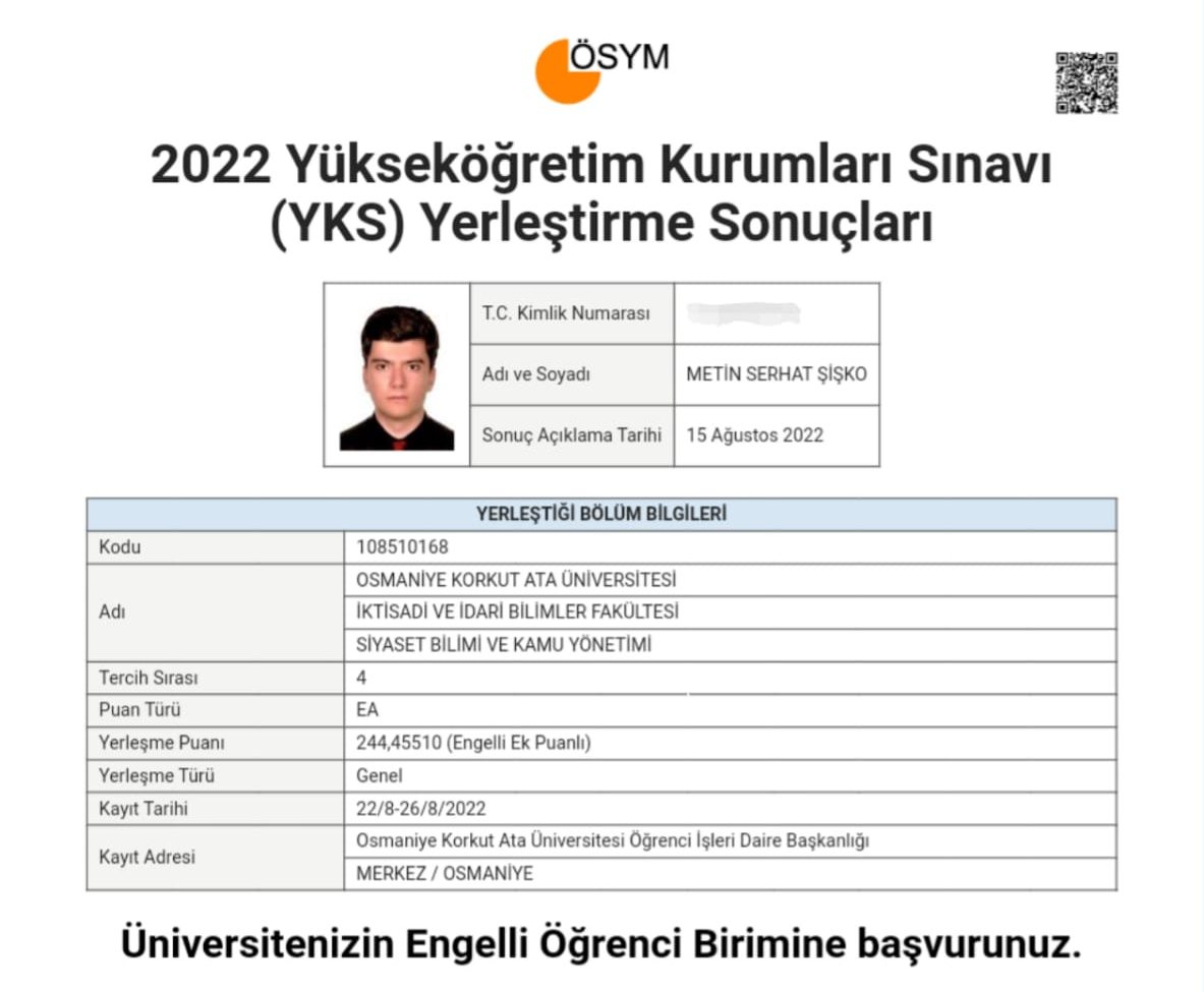 Azim ve kararlılıkla YKS’ye hazırlanan ve Öğrenme Güçlüğü eğitimi alan 20 yaşındaki Metin Serhat, öğretmenlerinin ısrarlı desteğiyle, kaymakam olmak hayaliyle çok çalıştı ve 2022 YKS’de Osmaniye Korkut Ata Üniversitesi Siyaset Bilimi ve Kamu Yönetimi Fakültesi’ni kazandı.