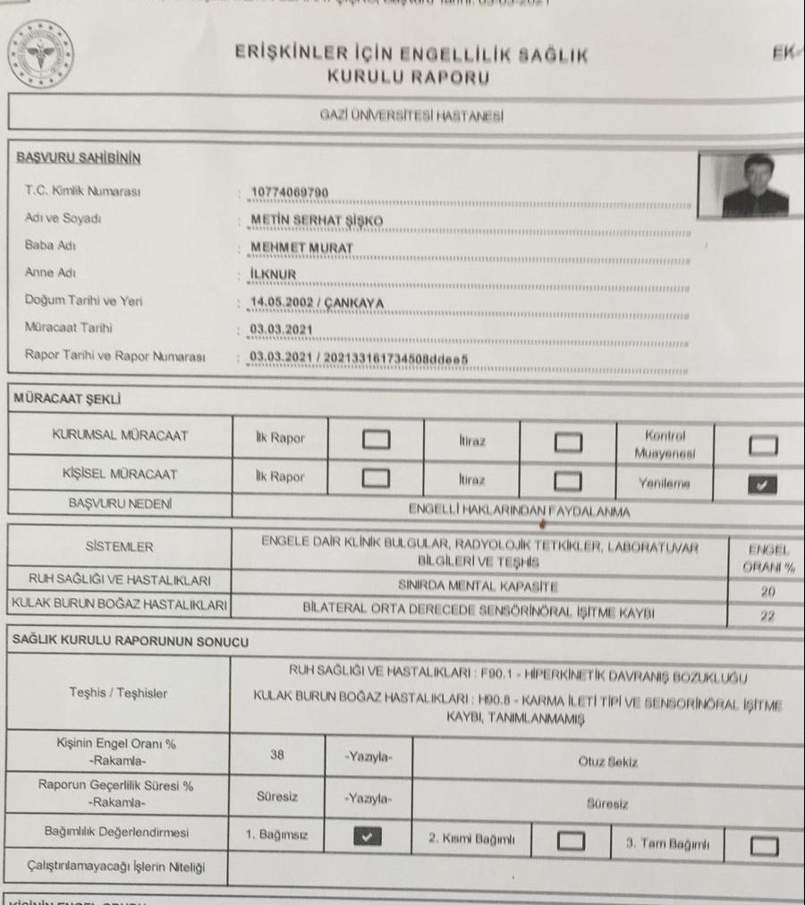 Metin Serhat Şişko 3 yıldır öğrenme güçlüğü nedeniyle Arsuz Gökmeydan Özel Rehabilitasyon Merkezi’nde ikiz kardeşiyle birlikte eğitim alıyordu. Üniversite sınavına çalışırken kaymakam olmak istediğini belirten Metin Serhat Şişko, öğretmenleri ve annesinin büyük desteğiyle sınavlara hazırlandı.