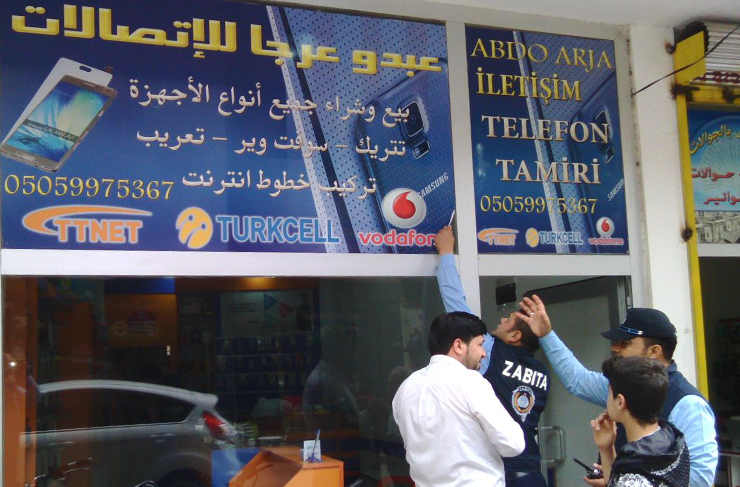 Kırıkhan Kaymakamlığında yapılan Suriyeli Sığınmacıların durumları ile ilgili değerlendirme toplantısında alınan kararlar doğrultusunda Belediye zabıta ekiplerimiz bugün itibarıyla işyerlerini dolaşıp işyeri sahiplerine gereken açıklamaları yaparak görüntü kirliliği oluşturan tabelaları ve afişleri anında söktü. Büyük tabelaların sökülmesi için uyarılarda bulunuldu.