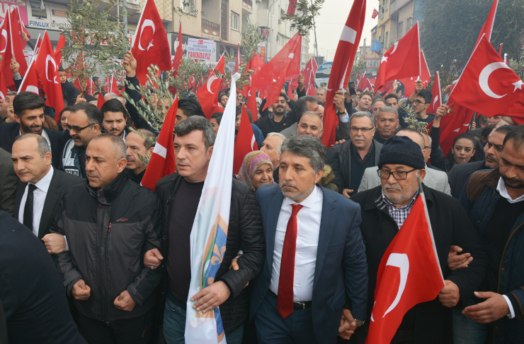 Afrin’deki Askerlerimize Destek Yürüyüşünde günün anlamını belirten bir konuşma yapan Belediye Başkanı Ayhan Yavuz; “Cephede savaşan Türk ordusuna, Afrin’deki operasyonda gecesini gündüzüne katan, göğsünü kurşunlara siper eden Türk ordusuna destek vermek üzere yediden yetmişe Vatanımıza gönül verenlerin ellerinde Türk bayrakları ve zeytin dalları ile beraber dualar ederek bu alana toplandık.