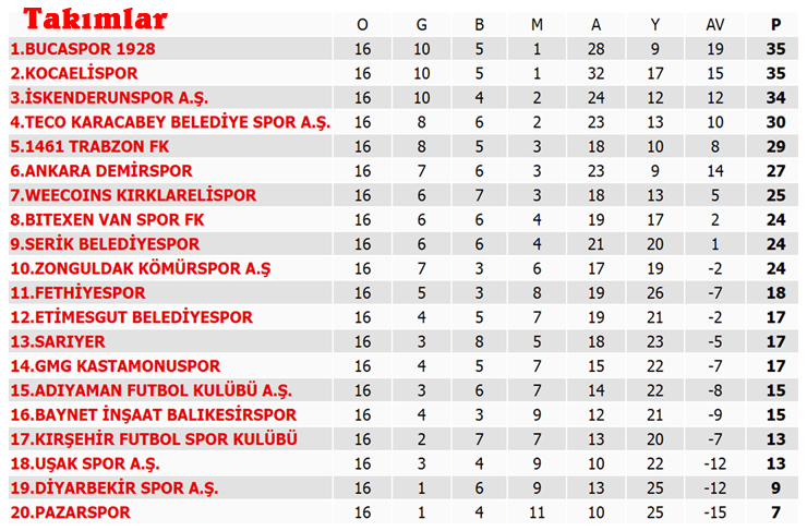 Grubun lideri Bucaspor 1928, 10 galibiyet 5 beraberlik ve 1 mağlubiyetle 35 puanda. Kocaelispor da yine 10 galibiyet 5 beraberlik ve 1 mağlubiyetle 35 puan topladı ancak averajla ikinci sırada yer alıyor. Temsilcimiz İskenderunspor ise 10 galibiyet 4 beraberlik ve 2 mağlubiyetle 34 puanda ve zirveyi yakın takibini sürdürüyor.