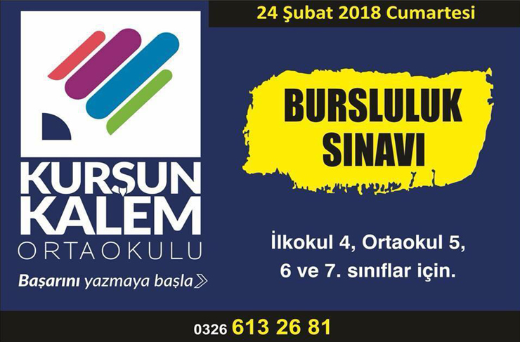 2017-2018 eğitim öğretim yılında, okullaşarak eğitim hizmetine başarıyla devam eden Kurşun Kalem Ortaokulu, 24 Şubat 2018 tarihinde bursluluk sınavı yapacak. İlkokul 4, ortaokul 5,6 ve 7. sınıflar için gerçekleştirilecek Bursluluk Sınavına katılmak isteyenler 0326 613 26 81 numaralı telefondan okul yetkililerine ulaşabilecek.