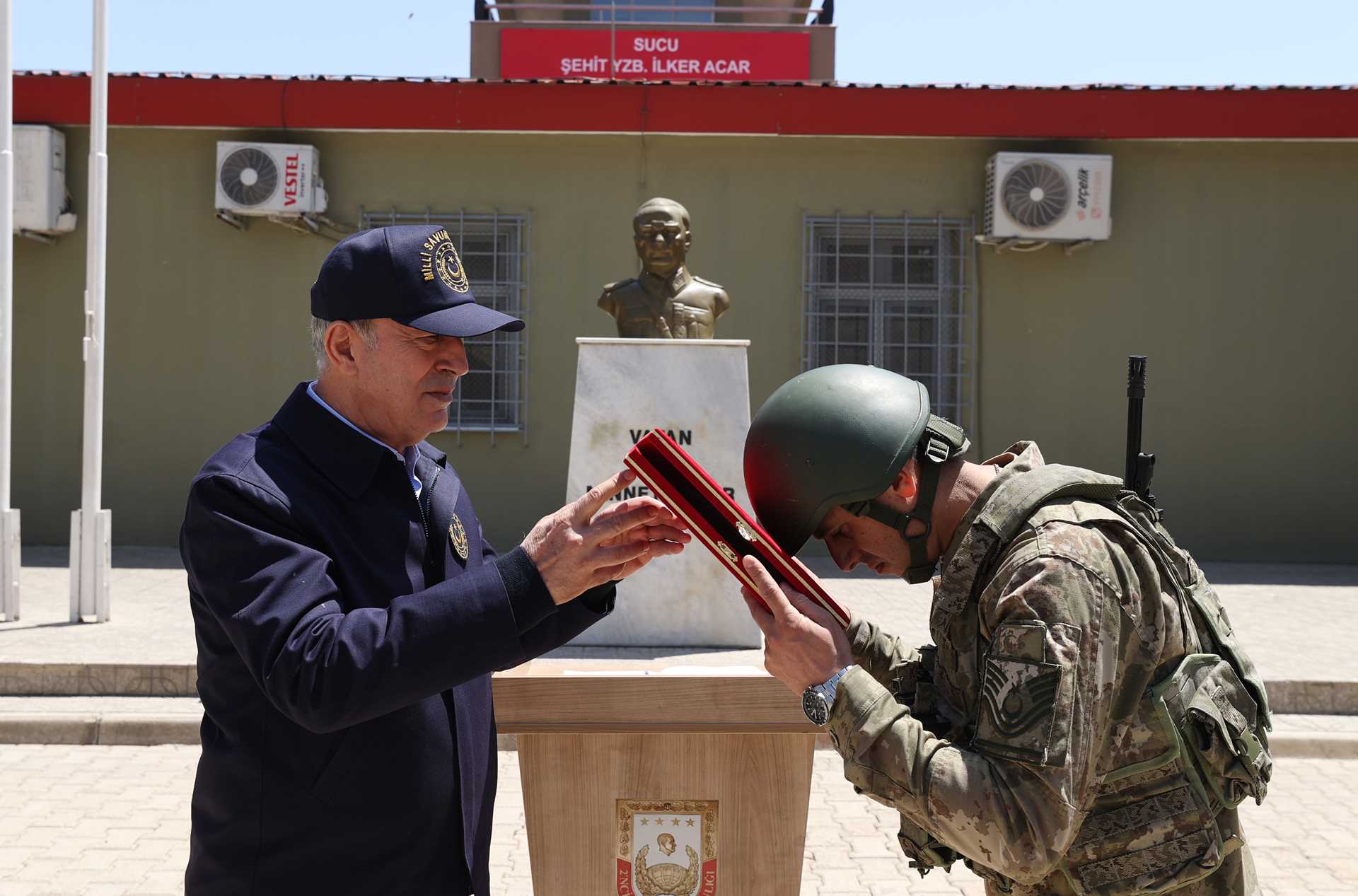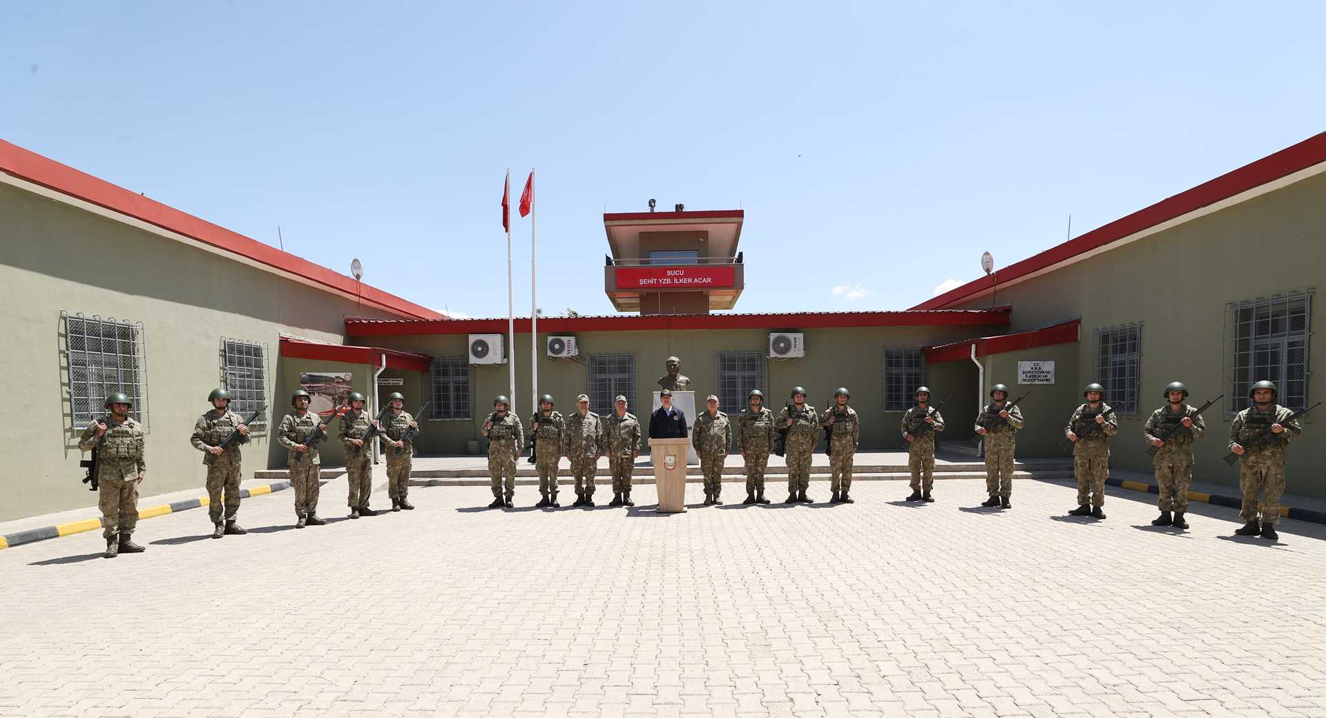 Bakan Akar, karşılamanın ardından programı dahilinde sınırın sıfır noktasına hareket etti. Akar, Şehit Yüzbaşı İlker Acar Hudut Karakolunda, 39’uncu Mekanize Piyade Tugay Komutanı Tuğgeneral Hakan Tutucu’dan hudut tekmili aldı. Hudut Karakol Komutanına Türk Bayrağını öperek emanet eden Bakan Akar daha sonra alınan tedbirlere ilişkin brifing de aldı. Bakan Akar, gözetleme kulesine çıkarak hududu da inceledi.