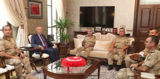 Hatay Valisi Erdal Ata, Zeytin Dalı Harekâtı’nda görev yapan Bornova Tugay Komutanı Tuğgeneral Turgay Aras ve beraberindeki heyeti makamında ağırladı.
