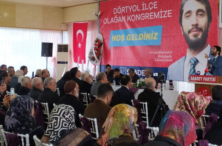 Saadet Partisi Dörtyol İlçe Kongresi Konya Milletvekili Abdulkadir Karaduman’ın katılımı ile gerçekleşti. Atatürk Parkı Düğün Salonu’nda gerçekleştirilen ve yoğun yağmura rağmen büyük ilgi duyulan 7. Olağan Kongreye Dörtyol Belediye Başkanı Fadıl Keskin, Ak Parti İlçe Başkanı M. Burak İzgi, CHP İlçe Başkanı Gökhan Özer, MHP İlçe Başkan Yard. Sinan Onur, İYİ Parti İlçe Başkanı Gürcan Eker, Saadet Partisi İl Başkanı Mustafa Eğe, DP İlçe Başkanı Hidayet Uygur, İYİ Parti meclis üyeleri Av. Emre Arık ve İlyas Uygur, Esnaf ve Sanatkarlar Odası Başkanı Ahmet Bölükbaşı, Şoförler Cemiyeti Başkanı Yavuz Çelebi, Atatürkçü Düşünce Derneği Dörtyol Şube Başkanı Özgür Çınar, Dörtyol Ticaret ve Sanayi Odası Yönetim Kurulu Üyesi Ahmet Bülbül ve bir çok STK temsilcileri ile partililer katıldı.