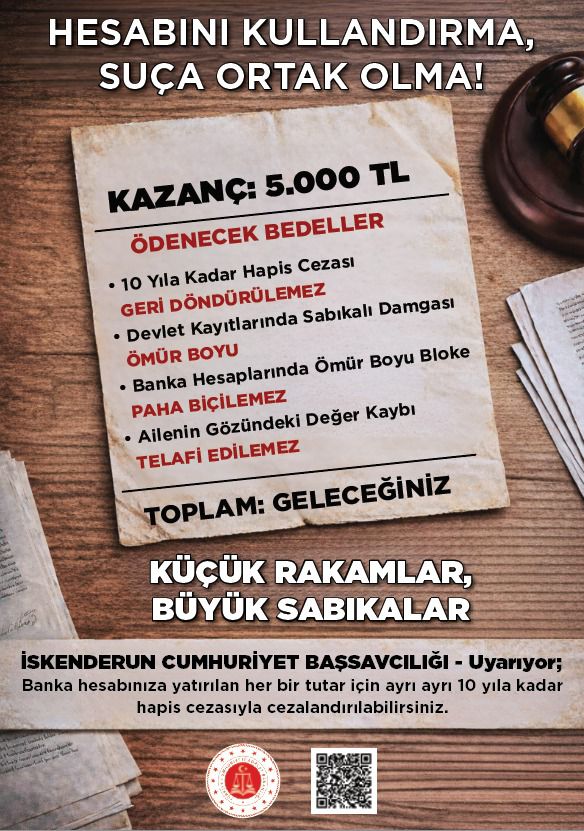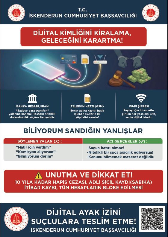 “Dijital kimliğini kiralama, geleceğini karalama” sloganıyla hazırlanan afişlerde; banka hesabı, telefon hattı ve Wi-Fi şifrelerinin başkalarına kullandırılmasının ciddi suçlara ortak olmak anlamına gelebileceği vurgulandı. İskenderun Cumhuriyet Başsavcılığı, özellikle kolay kazanç vaadiyle hesap bilgilerini paylaşan kişilerin farkında olmadan dolandırıcılık ve benzeri suçların parçası haline gelebildiğine dikkat çekti.