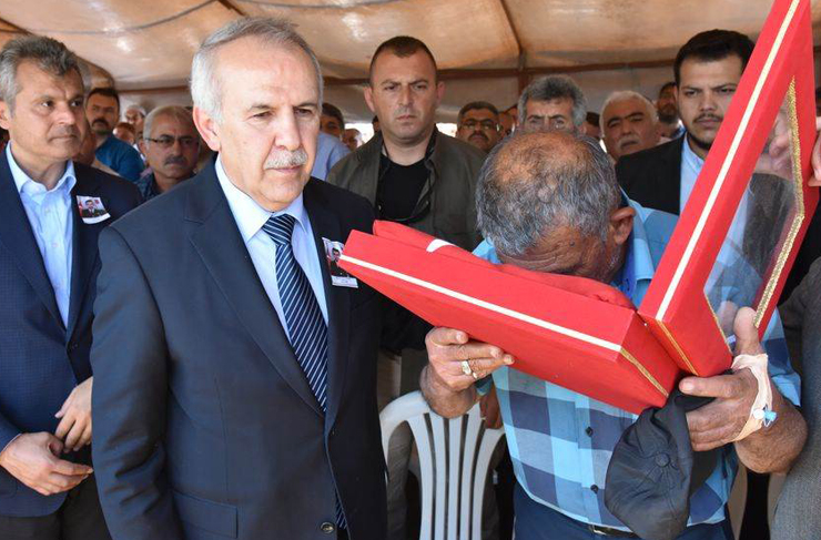 Şehidimizin ailesini teselli ederek sabır dileyen Vali Ata, 2 aylık evli olan Şehit Mehmet Gücüyetmez’in naaşının sarıldığı Türk Bayrağı’nı şehidimizin babasına verirken, Adana Jandarma Bölge Komutanı Tümgeneral Hacı İlbaş da şehidimizin eşine Türk Bayrağı vererek başsağlığı dileğinde bulundu.