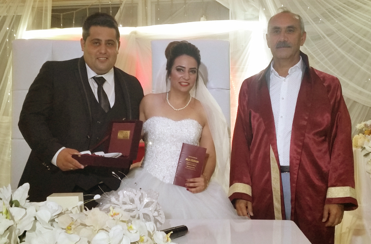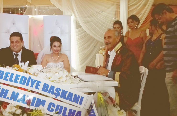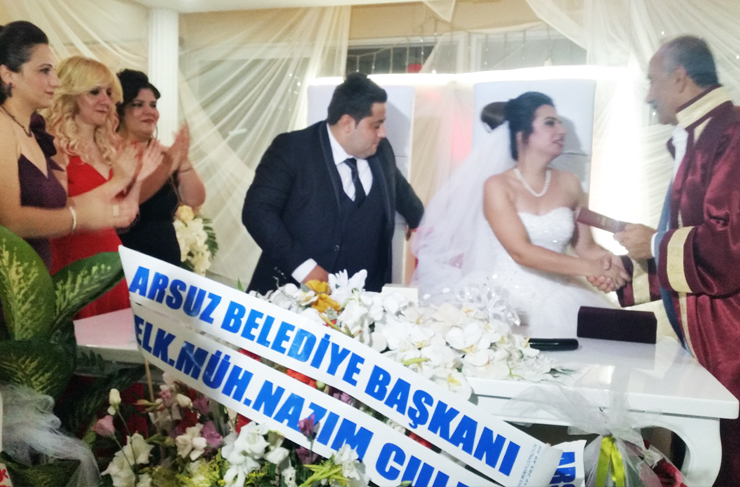 Başkan Nazım Culha’nın kıydığı, şahitliğini ise belediye personellerinden Jenny Corcet Katar, Sevda Tümkaya ve Kamuran İnan’ın yaptığı nikâhta davetlilerin huzurunda evet diyerek mutluluğa yelken açan Buket-Sercan çiftinin oldukça heyecanlı oldukları gözlendi.