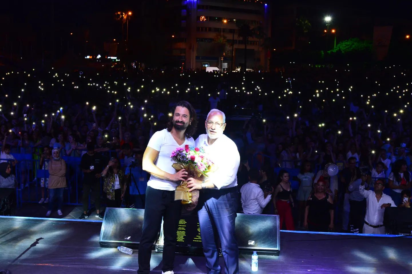 Konser sonrası ünlü sanatçı Koray Avcı’ya çiçek takdiminde bulunan Başkan Tosyalı, unutulmaz gece için sanatçıya teşekkürlerini iletti. (Haber: İlyas Edip TERBİYELİ)