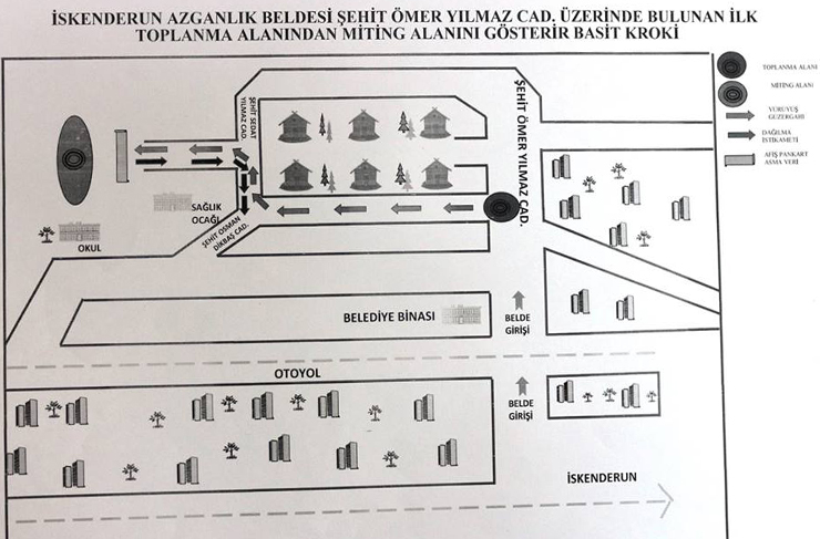 3-Karayılan Mahallesi, ilk toplanma bölgesi olan Utku Acun Caddesi ile 3’üncü Caddenin kesiştiği noktadan başlamak üzere Utku Acun Caddesini takiben Eski Belediye Binası arkasında bulunan boş alan, toplantı sonunda Utku Acun Caddesini takiben Komando Caddesi 1,2 ve 3′ üncü Caddeler dağılmaya açık tutulur.